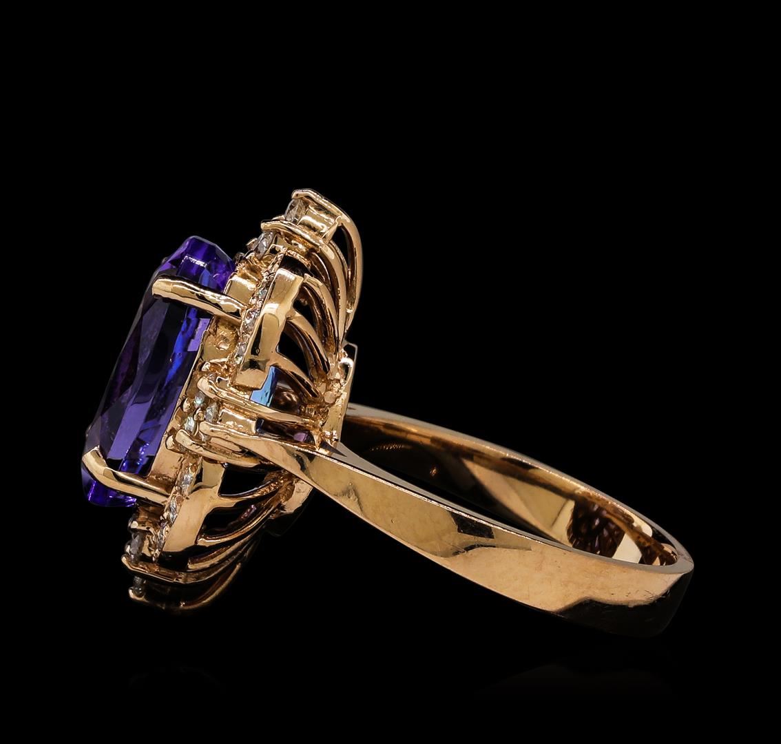 One electronically tested 14KT rose gold ladies cast tanzanite and diamond ring with a bright polish finish. The featured tanzanite is set within a stylized diamond bezel supported by a ribbed under gallery, completed by a three millimeter wide band. Identified with markings of 'K14'. Condition is new, good workmanship. Containing: One prong set oval mixed cut natural tanzanite, measuring 13.40 x 9.40 x 7.40mm, 5%. bulge factor, approximate weight of 6.89ct., clarity is eye clean, type I, medium, very slightly grayish, bluish violet color, (GIA bV 5/3), cut is good. Transmitting light with no distortion, transparent. Colored Stone Grading Report attached. Graded in the setting. Tanzanite is a very rare gemstone that is only found in the country of Tanzania. Originally discovered in 1967. Tiffany & Company, named the stone Tanzanite. It is found in the Usumburu Mountains that border the Umba Valley of northern Tanzania. Tanzanite occurs in gray, brown, violet, blue, reddish-purple, & green. The gem is interesting because of its exceptional pleochroism. Rotated in different directions a tanzanite will exhibit multiple changes of color. Tanzanite has a low tolerance to ultrasonic cleaning, and should not be cleaned using this method. Twelve prong set round brilliant cut diamonds, measuring 2.00 - 1.90 x 1.17mm (depth est.) approximate total weight of 12 Stones = 0.35ct. The color and clarity grades reflect the entire ranges of color and clarity for this group. Graded in the setting. Clarity SI-1 to I-2. Color: F - I Sixteen prong set round brilliant cut diamonds, measuring 1.40 - 1.40 x 0.84mm (depth est.) approximate total weight of 16 Stones = 0.19ct. The color grade reflects the entire range of color for this group. Graded in the setting. Clarity SI-2 to I-2. Color: F - I. Total Weight of Colored Stones 6.89ct.. Total Weight of Diamonds 0.54ct.. Total Weight of Ring 8.24gm. AIG Appraised at $15,910.00.