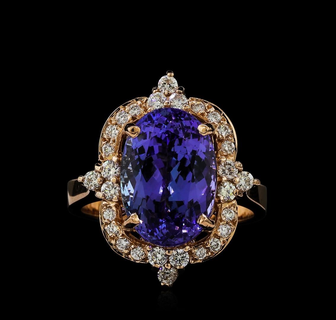 One electronically tested 14KT rose gold ladies cast tanzanite and diamond ring with a bright polish finish. The featured tanzanite is set within a stylized diamond bezel supported by a ribbed under gallery, completed by a three millimeter wide band. Identified with markings of 'K14'. Condition is new, good workmanship. Containing: One prong set oval mixed cut natural tanzanite, measuring 13.40 x 9.40 x 7.40mm, 5%. bulge factor, approximate weight of 6.89ct., clarity is eye clean, type I, medium, very slightly grayish, bluish violet color, (GIA bV 5/3), cut is good. Transmitting light with no distortion, transparent. Colored Stone Grading Report attached. Graded in the setting. Tanzanite is a very rare gemstone that is only found in the country of Tanzania. Originally discovered in 1967. Tiffany & Company, named the stone Tanzanite. It is found in the Usumburu Mountains that border the Umba Valley of northern Tanzania. Tanzanite occurs in gray, brown, violet, blue, reddish-purple, & green. The gem is interesting because of its exceptional pleochroism. Rotated in different directions a tanzanite will exhibit multiple changes of color. Tanzanite has a low tolerance to ultrasonic cleaning, and should not be cleaned using this method. Twelve prong set round brilliant cut diamonds, measuring 2.00 - 1.90 x 1.17mm (depth est.) approximate total weight of 12 Stones = 0.35ct. The color and clarity grades reflect the entire ranges of color and clarity for this group. Graded in the setting. Clarity SI-1 to I-2. Color: F - I Sixteen prong set round brilliant cut diamonds, measuring 1.40 - 1.40 x 0.84mm (depth est.) approximate total weight of 16 Stones = 0.19ct. The color grade reflects the entire range of color for this group. Graded in the setting. Clarity SI-2 to I-2. Color: F - I. Total Weight of Colored Stones 6.89ct.. Total Weight of Diamonds 0.54ct.. Total Weight of Ring 8.24gm. AIG Appraised at $15,910.00.