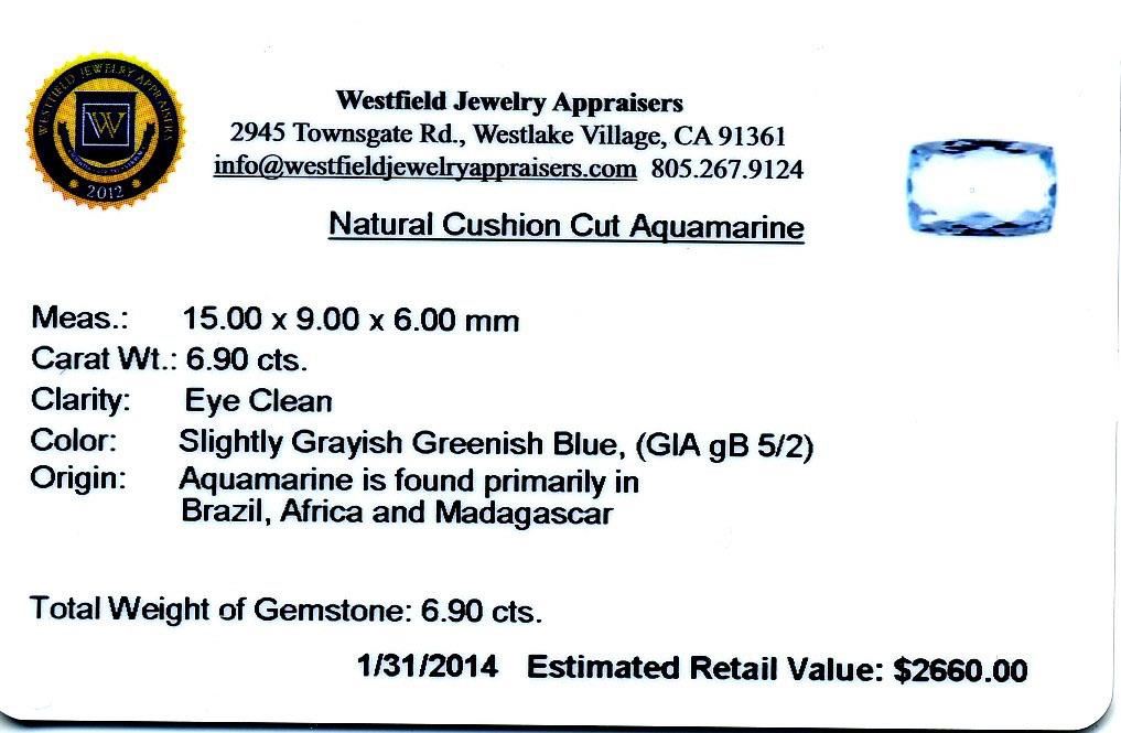 6.90ct. Natural Cushion Cut Aquamarine Westfield Appraised at $2,660.00.