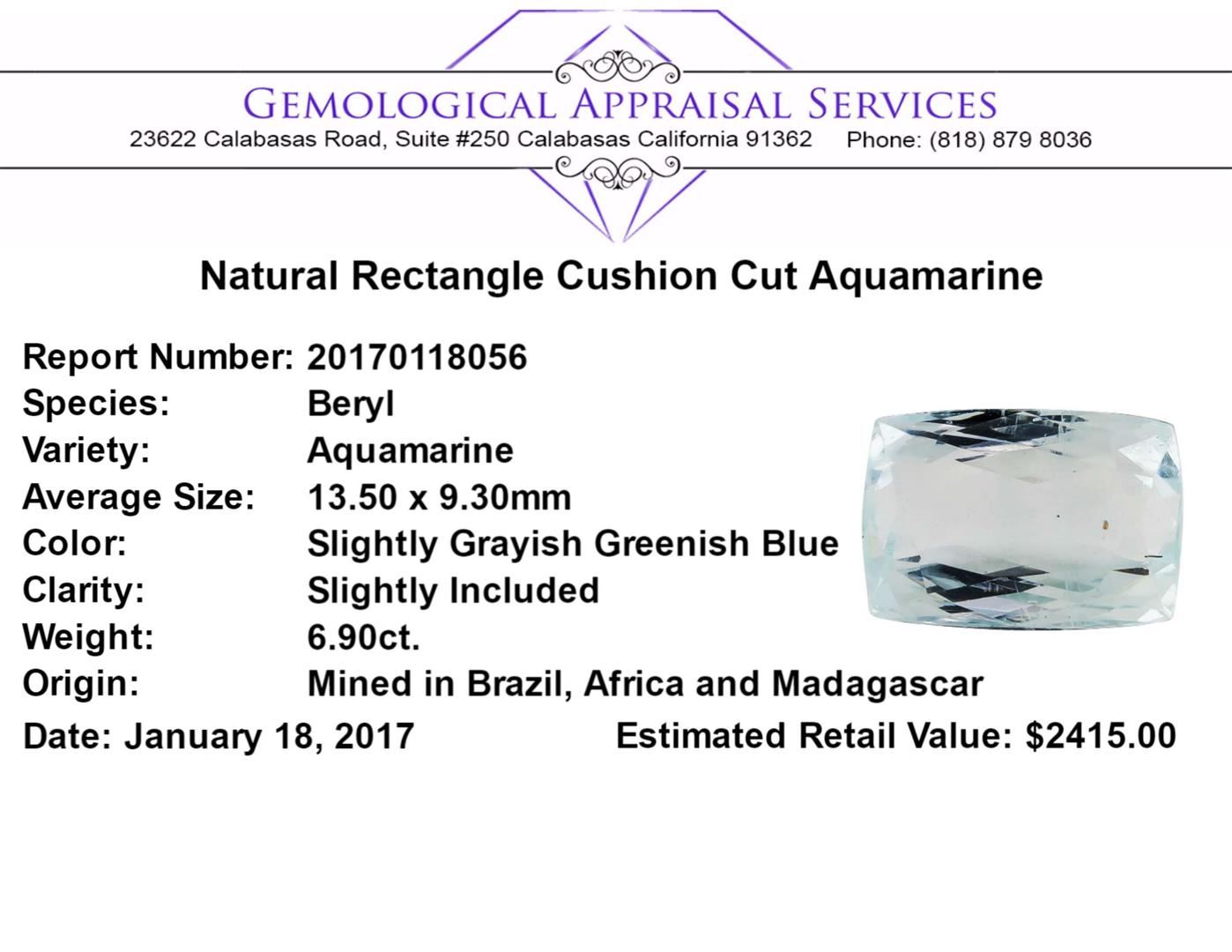 One natural rectangle cushion cut aquamarine with an exact weight of 6.90ct., clarity is slightly included, slightly grayish greenish blue. Gemological Appraisals Services estimates the retail value at $2415 GAS Appraised.