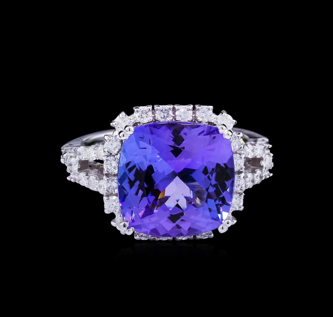 One electronically tested 14KT white gold lady's combination cast & assembled fashion ring with a cathedral shank with a halo with a bright polish finish. The featured lady's ring has a shank measuring 1.90 millimeters wide. Identified with markings of "K14". Condition is new, good workmanship. Containing: One prong set square cushion modified brilliant cut natural tanzanite, measuring 11.94 x 11.90 x 6.72mm, approximate weight of 6.90ct., clarity is eye clean, type I, medium, moderately strong, bluish violet color, (GIA bV 5/4), cut is very good. Transmitting light with no distortion, transparent. Colored gemstones are presumed to have been subjected to commonly used enhancement processes. Graded in the setting. Twenty-Six prong set round brilliant cut diamonds, measuring 1.90 - 1.80 x 1.15mm (depth est.) approximate total weight of 26 Stones = 0.64ct. Graded in the setting. Clarity: SI-1 to I-1. Color: H - I. Cut Good Thirty prong set round brilliant cut diamonds, measuring 1.50 - 1.40 x 0.91mm (depth est.) approximate total weight of 30 Stones = 0.35ct. Graded in the setting. Clarity: SI-1 to I-1. Color: H - I. Cut Good Twelve prong set round brilliant cut diamonds, measuring 1.10 - 1.05 x 0.69mm (depth est.) approximate total weight of 12 Stones = 0.06ct. Graded in the setting. Clarity: SI-1 to I-1. Color: H - I. Cut Good. Total Weight of Colored Stones 6.90ct. Total Weight of Diamonds 1.05ct. Total Weight of Ring 7.10gm. GAS Appraised at $14,005.00.
