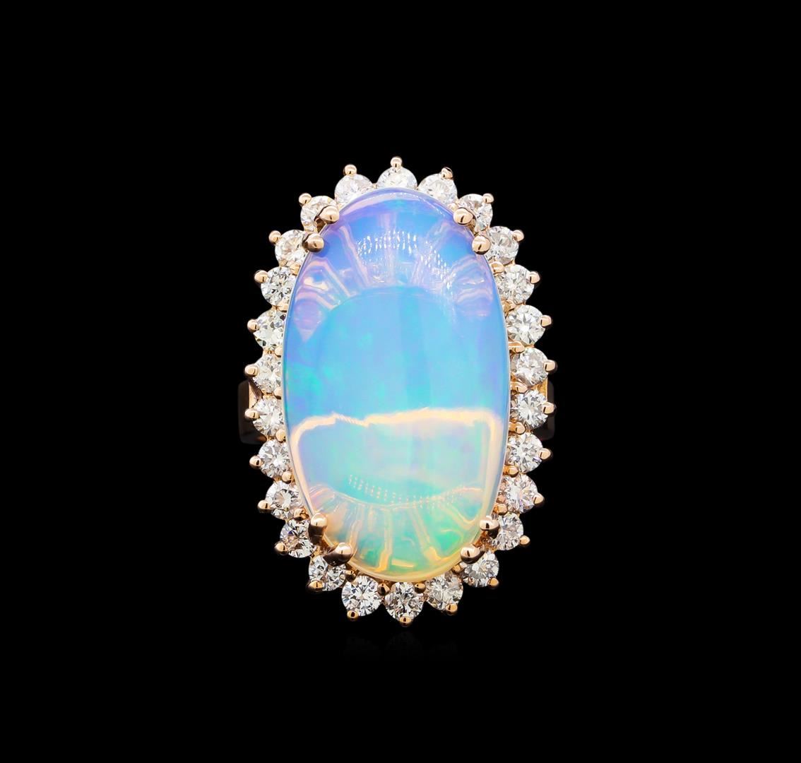 One 14K Rose gold lady's ring. 10.00 Gr. Containing: Main gemstones: Identity: Opal. Carat weight: 6.91 CTS TW. Shape and measurement: Oval shape cabochon. Quality: Fine color. Adjacent gemstones : Identity: Natural diamond. Shape: Round cut. Carat weight: 1.40 CTS TW. Quality: SI clarity, G-H color. All fine cutting and proportions. total gemstones weight: 8.31 CTS TW. RBGS Appraised at $4,640.00.