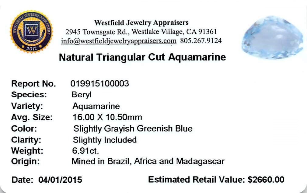 One triangle cut natural aquamarine exact weight 6.91ct., clarity is slightly included, type I, medium, slightly grayish, very slightly greenish blue color, (GIA vslgB 5/2), cut is good. Westfield Appraised at $2,660.00.