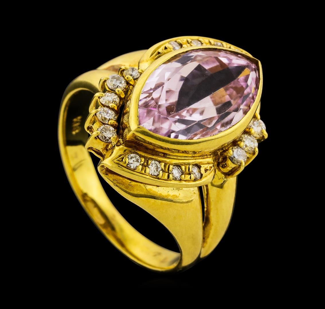 One ring featuring: 18KT Yellow Gold containing Kunzite with a total weight of 6.92ct and Diamonds with a total weight of 0.28ct. Total Weight of Ring: 10.9 grams.
