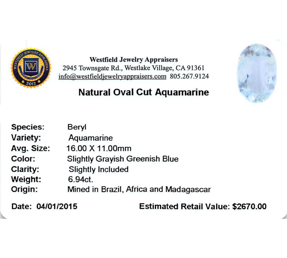 One oval cut natural aquamarine exact weight 6.94ct., clarity is slightly included, type I, medium light, slightly grayish, very slightly greenish blue color, (GIA vslgB 4/2), cut is good. Westfield Appraised at $2,670.00.
