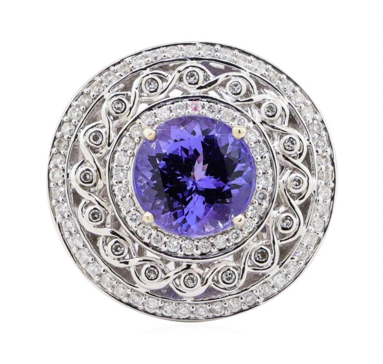 One electronically tested 14KT white gold ladies cast tanzanite & diamond ring with a bright finish. The featured tanzanite is set within three unique diamond bezels, supported by an elaborate white gold under gallery, and tapering shoulders, completed by a five millimeter wide band. Trademark is RT. Identified with markings of "14K". Condition is new, good workmanship. Containing: One prong set round mixed cut natural tanzanite, measuring 11.10 - 11.00 x 7.90 mm, approximate weight of 6.94ct., clarity is eye clean, type I, medium dark, slightly grayish, violet color, (GIA V 6/2) to medium dark, slightly grayish, bluish purple, (GIA bP 6/2), cut is good. Transmitting light with no distortion, transparent. Graded in the setting. Tanzanite is a very rare gemstone that is only found in the country of Tanzania. Originally discovered in 1967. Tiffany & Company, named the stone Tanzanite. It is found in the Usumburu Mountains that border the Umba Valley of northern Tanzania. Tanzanite occurs in gray, brown, violet, blue, reddish-purple, & green. The gem is interesting because of its exceptional pleochroism. Rotated in different directions a tanzanite will exhibit multiple changes of color. Tanzanite has a low tolerance to ultrasonic cleaning, and should not be cleaned using this method. Sixteen bezel set single cut diamonds, measuring 1.20 - 1.20 x 0.72mm (depth est.) approximate total weight of 16 Stones = 0.10 ct. Set & graded in the central bezel. Clarity VS-2 to SI-2 Color H - I Seventy-Seven prong set round brilliant cut diamonds, measuring 1.60 - 1.40 x 0.90mm (depth est.) approximate total weight of 77 Stones = 0.86ct. Set & graded in the inner and the outer bezel. Clarity I-1 to I-2 Color G - I Total Weight of Colored Stones 6.94 ct. Estimated Retail Value $ 22,100.00 US