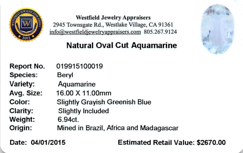 One oval cut natural aquamarine exact weight 6.94ct., clarity is slightly included, type I, medium light, slightly grayish, very slightly greenish blue color, (GIA vslgB 4/2), cut is good. Westfield Appraised at $2,670.00.