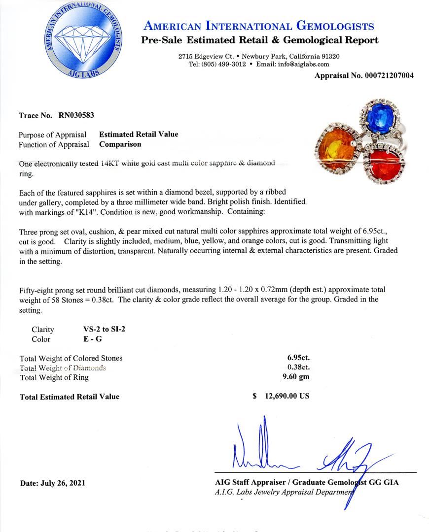 One electronically tested 14KT white gold cast multi color sapphire and diamond ring. Each of the featured sapphires is set within a diamond bezel, supported by a ribbed under gallery, completed by a three millimeter wide band. Bright polish finish. Identified with markings of "K14". Condition is new, good workmanship. Three prong set oval, cushion, and pear mixed cut natural multi color sapphires approximate total weight of 6.95ct., cut is good. Clarity is slightly included, medium, blue, yellow, and orange colors, cut is good. Transmitting light with a minimum of distortion, transparent. Naturally occurring internal & external characteristics are present. Graded in the setting. Fifty-eight prong set round brilliant cut diamonds, measuring 1.20 - 1.20 x 0.72mm (depth est.) approximate total weight of 58 Stones = 0.38ct. The clarity & color grade reflect the overall average for the group. Graded in the setting. Clarity: VS-2 to SI-2 Color: E - G Total Weight of Colored Stones: 6.95ct. Total Weight of Diamonds: 0.38ct. Total Weight of Ring: 9.60 gm Size: 7