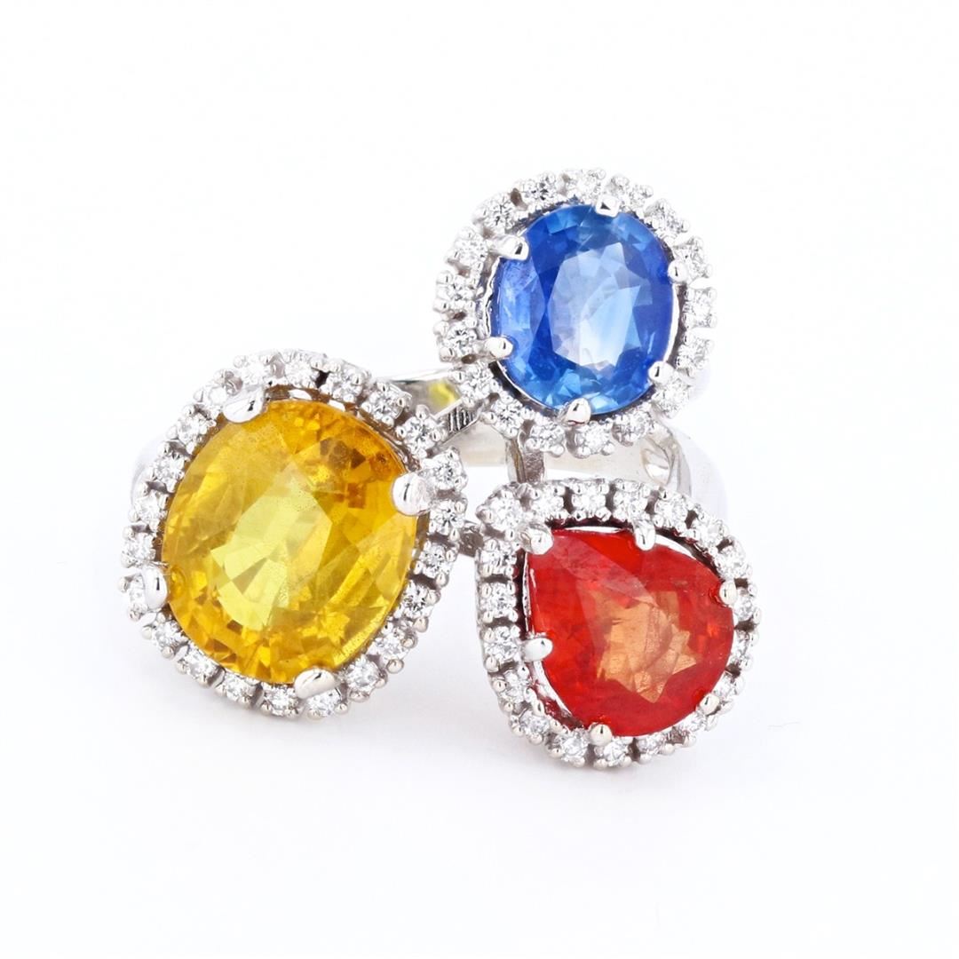 6.95ctw Multi-colored Sapphire and 0.38ctw Diamond 14K White Gold Ring. Please see Photos and Description for all available information. This exceptional ring features a 6.95ctw multi-colored sapphire center stone and 58 round diamonds, totaling 0.38ctw. The color of the sapphires ranges from blue to yellow to orange. The 6.95ctw center stone is surrounded by 58 round diamonds, totaling 0.38ctw, in a 14K white gold band. The ring's unique design makes it a truly one-of-a-kind piece. This ring is available in a size 6 3/4.