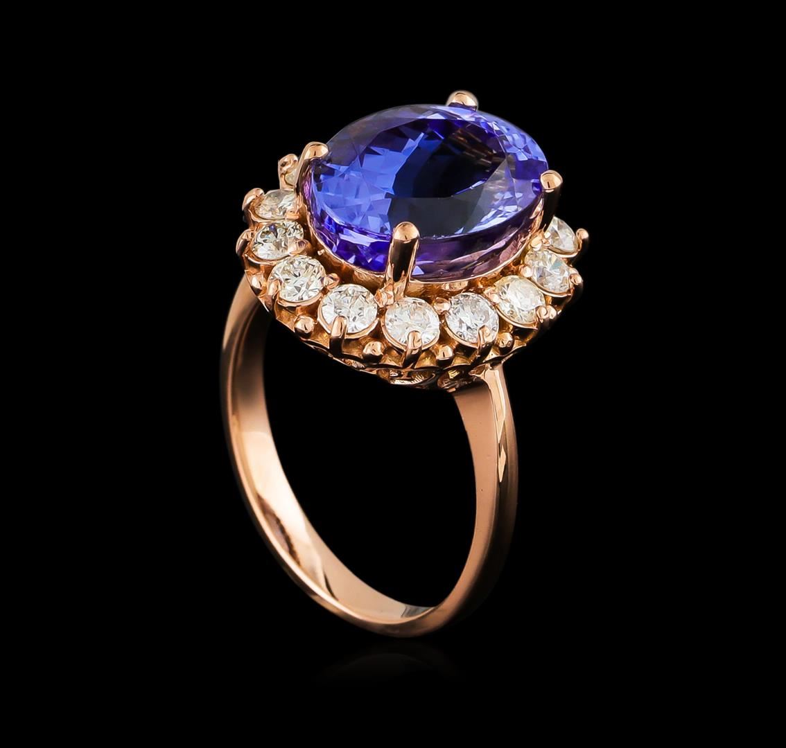 One electronically tested 14KT rose gold ladies cast tanzanite and diamond ring with a bright polish finish. The featured tanzanite is set within a diamond bezel supported by an elaborate lattice under gallery, completed by a two millimeter wide band. Identified with markings of "K14". Condition is new, good workmanship. Containing: One prong set oval mixed cut natural tanzanite, measuring 12.80 x 9.50 x 7.90mm, 3%. bulge factor, approximate weight of 6.96ct., clarity is eye clean, type I, medium dark, very slightly grayish, bluish violet color, (GIA bV 6/3), cut is good. Transmitting light with no distortion, transparent. Colored Stone Grading Report attached. Graded in the setting. Tanzanite is a very rare gemstone that is only found in the country of Tanzania. Originally discovered in 1967. Tiffany & Company, named the stone Tanzanite. It is found in the Usumburu Mountains that border the Umba Valley of northern Tanzania. Tanzanite occurs in gray, brown, violet, blue, reddish-purple, & green. The gem is interesting because of its exceptional pleochroism. Rotated in different directions a tanzanite will exhibit multiple changes of color. Tanzanite has a low tolerance to ultrasonic cleaning, and should not be cleaned using this method. Fourteen prong set round brilliant cut diamonds, measuring 2.70 - 2.70 x 1.62mm (depth est.) approximate total weight of 14 Stones = 1.02ct. Graded in the setting. Clarity: SI-2 to I-2. Color: G - I. Total Weight of Colored Stones 6.96ct. Total Weight of Diamonds 1.02ct. Total Weight of Ring 6.73gm. AIG Appraised at $18,290.00.