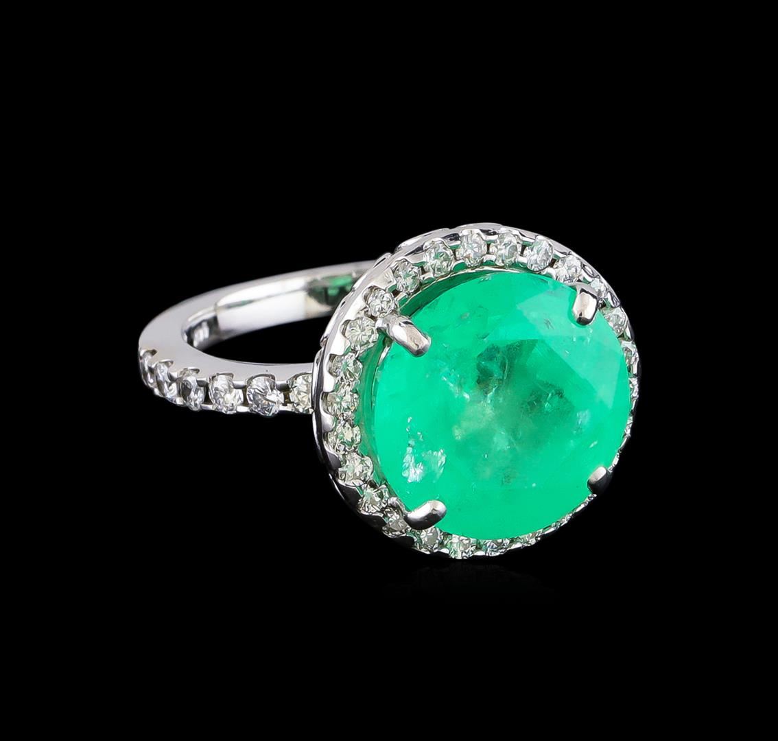 One electronically tested 14KT white gold lady's cast fashion ring with a basket halo with a bright polish finish. The featured lady's ring has a shank measuring 2.0 millimeters in width. Identified with markings of "14K". Condition is new, good workmanship. Containing: One prong set round modified brilliant cut natural emerald, measuring 12.11 - 12.00 x 8.27 mm, (depth est.) 5%. bulge factor, approximate weight of 6.97ct., clarity is heavily included, medium light, moderately strong, green color, (GIA G 4/4), cut is good. Transmitting light somewhat diffusely, transparent to translucent. Colored gemstones are presumed to have been subjected to commonly used enhancement processes. Indications of oil residue. Graded in the setting. Twelve prong set round brilliant cut diamonds, measuring 1.90 - 1.80 x 1.11mm (depth est.) approximate total weight of 12 Stones = 0.30ct. Graded in the setting. Clarity: SI-1 to SI-2. Color: G - Good Twenty-Six prong set round brilliant cut diamonds, measuring 1.60 - 1.50 x 0.95mm (depth est.) approximate total weight of 26 Stones = 0.36ct. Graded in the setting. Clarity: VS to SI-2. Color: G - Good. Total Weight of Colored Stones 6.97ct. Total Weight of Diamonds 0.66ct. Total Weight of Ring 6.70gm GAS Appraised at $13,965.00.