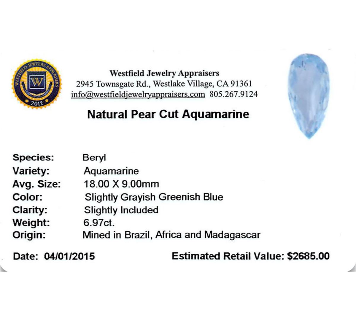 One pear cut natural aquamarine exact weight 6.97ct., clarity is slightly included, type I, medium, very slightly grayish, very slightly greenish blue color, (GIA vslgB 5/3), cut is good. Westfield Appraised at $2,685.00.