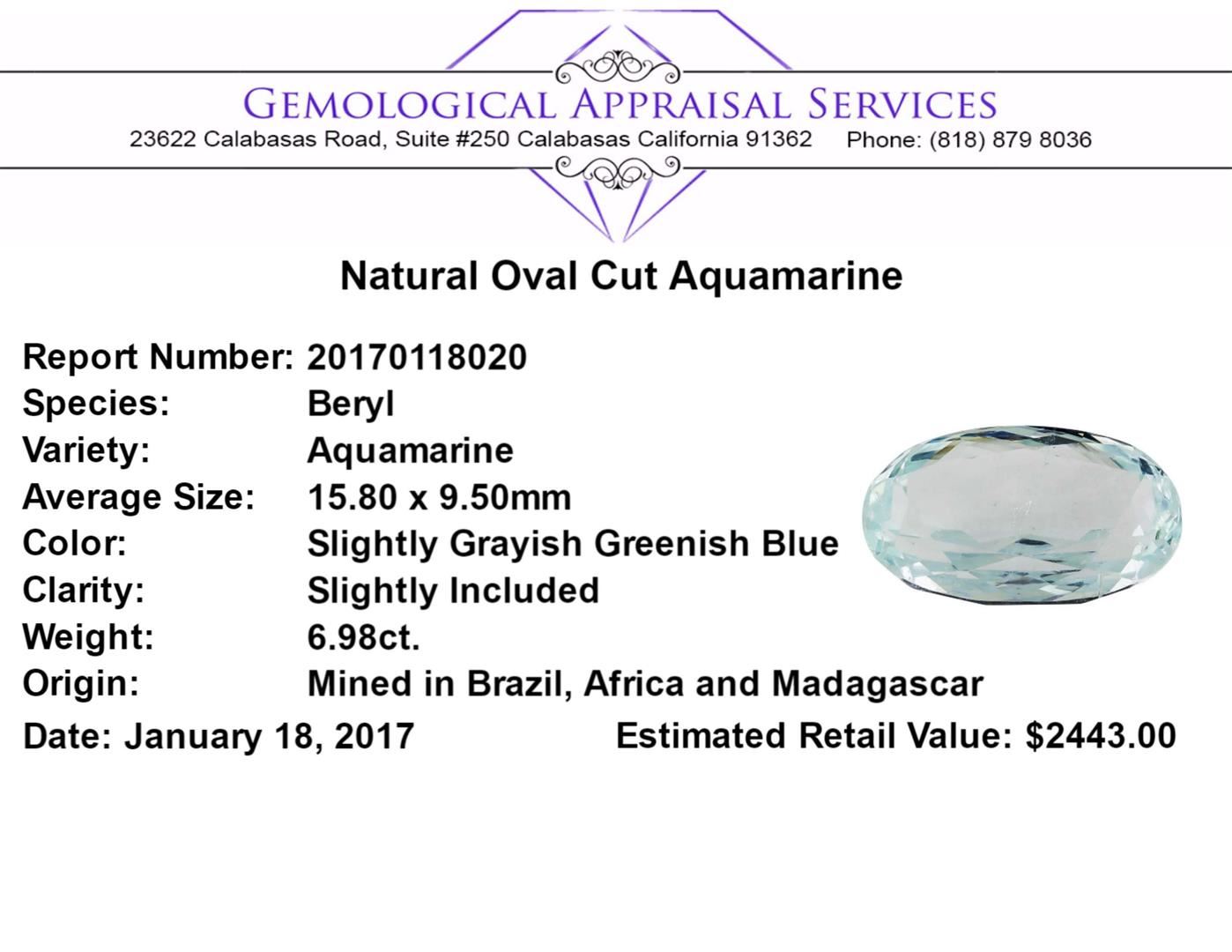 One natural oval cut aquamarine with an exact weight of 6.98ct., clarity is slightly included, slightly grayish greenish blue. Gemological Appraisals Services estimates the retail value at $2443 GAS Appraised.