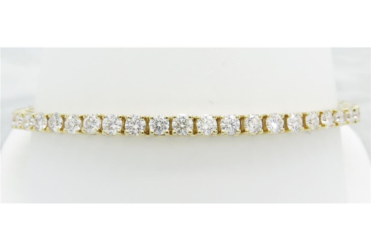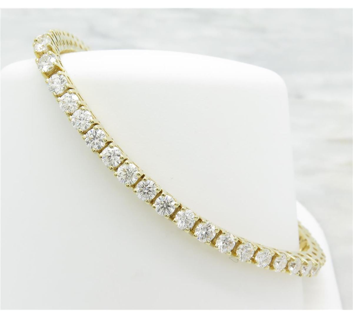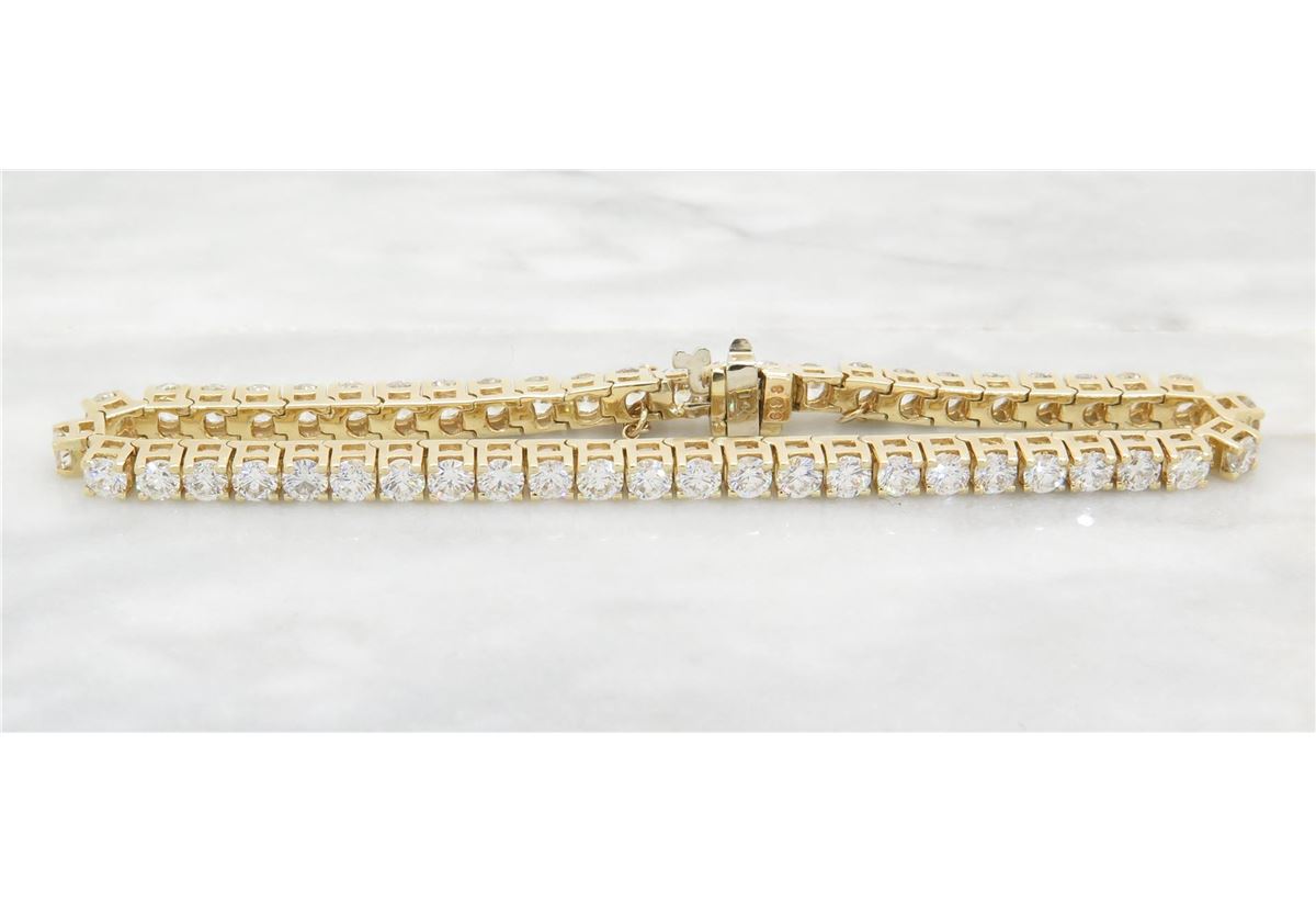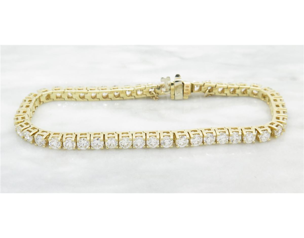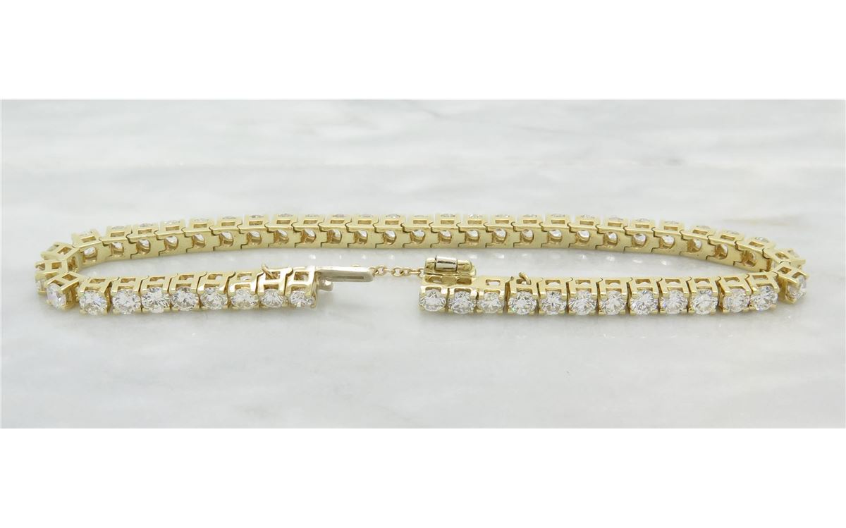 One tested 14K yellow gold diamond bracelet. Containing: 50 Round Brilliant Cut Diamonds. Clarity: SI1-I1, Color: G-I. Approximate total diamond weight: 6.98CTW. All diamonds are graded in the mounting unless otherwise stated. Weight of necklace: 13.7 grams, Size: 7" long.