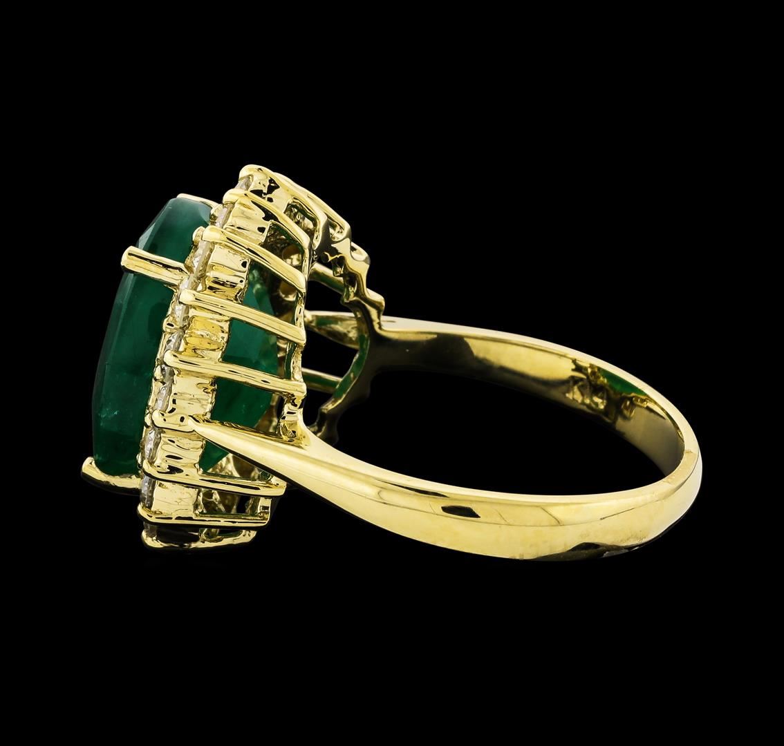 One electronically tested 14KT yellow gold lady's cast fashion ring with a basket halo with a bright polish finish. The featured lady's ring has a shank measuring 2.64 millimeters wide. Identified with markings of 'K14'. Condition is new, good workmanship. Containing: One prong set oval modified mixed cut natural emerald, measuring 13.15 x 10.56 x 7.26mm, (depth est.) 20%. bulge factor, approximate weight of 6.98ct., clarity is heavily included, medium dark, moderately strong, green color, (GIA G 6/4), cut is good. Transmitting light somewhat diffusely, semi-transparent to translucent. Naturally occurring internal & external characteristics are present. Indications of oil residue. Colored gemstones are presumed to have been subjected to commonly used enhancement processes. Graded in the setting. Eighteen prong set round brilliant cut diamonds, measuring 2.45 - 2.35 x 1.46mm (depth est.) approximate total weight of 18 Stones = 0.93ct. Graded in the setting. Clarity SI-1 to SI-3. Color: H - I Cut Good. Total Weight of Colored Stones 6.98ct.. Total Weight of Diamonds 0.93ct.. Total Weight of Ring 5.70gm. GAS Appraised at $9,805.00.