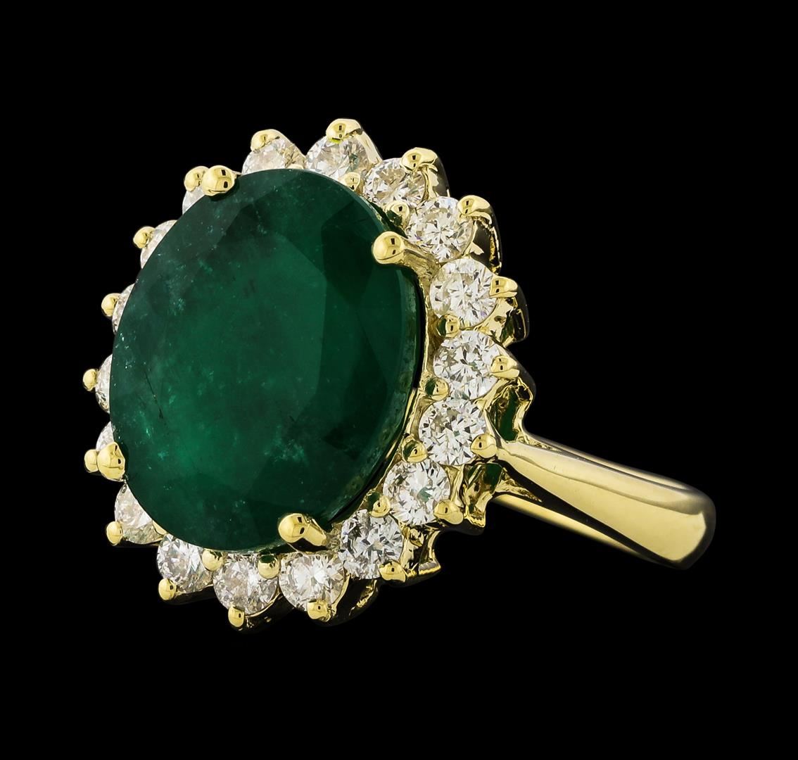 One electronically tested 14KT yellow gold lady's cast fashion ring with a basket halo with a bright polish finish. The featured lady's ring has a shank measuring 2.64 millimeters wide. Identified with markings of 'K14'. Condition is new, good workmanship. Containing: One prong set oval modified mixed cut natural emerald, measuring 13.15 x 10.56 x 7.26mm, (depth est.) 20%. bulge factor, approximate weight of 6.98ct., clarity is heavily included, medium dark, moderately strong, green color, (GIA G 6/4), cut is good. Transmitting light somewhat diffusely, semi-transparent to translucent. Naturally occurring internal & external characteristics are present. Indications of oil residue. Colored gemstones are presumed to have been subjected to commonly used enhancement processes. Graded in the setting. Eighteen prong set round brilliant cut diamonds, measuring 2.45 - 2.35 x 1.46mm (depth est.) approximate total weight of 18 Stones = 0.93ct. Graded in the setting. Clarity SI-1 to SI-3. Color: H - I Cut Good. Total Weight of Colored Stones 6.98ct.. Total Weight of Diamonds 0.93ct.. Total Weight of Ring 5.70gm. GAS Appraised at $9,805.00.