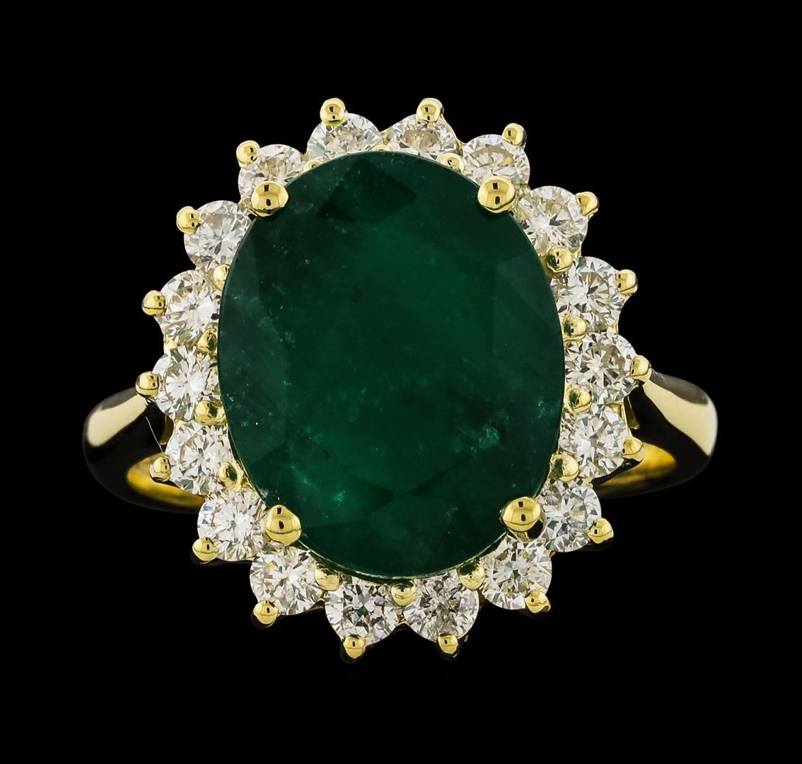 One electronically tested 14KT yellow gold lady's cast fashion ring with a basket halo with a bright polish finish. The featured lady's ring has a shank measuring 2.64 millimeters wide. Identified with markings of 'K14'. Condition is new, good workmanship. Containing: One prong set oval modified mixed cut natural emerald, measuring 13.15 x 10.56 x 7.26mm, (depth est.) 20%. bulge factor, approximate weight of 6.98ct., clarity is heavily included, medium dark, moderately strong, green color, (GIA G 6/4), cut is good. Transmitting light somewhat diffusely, semi-transparent to translucent. Naturally occurring internal & external characteristics are present. Indications of oil residue. Colored gemstones are presumed to have been subjected to commonly used enhancement processes. Graded in the setting. Eighteen prong set round brilliant cut diamonds, measuring 2.45 - 2.35 x 1.46mm (depth est.) approximate total weight of 18 Stones = 0.93ct. Graded in the setting. Clarity SI-1 to SI-3. Color: H - I Cut Good. Total Weight of Colored Stones 6.98ct.. Total Weight of Diamonds 0.93ct.. Total Weight of Ring 5.70gm. GAS Appraised at $9,805.00.