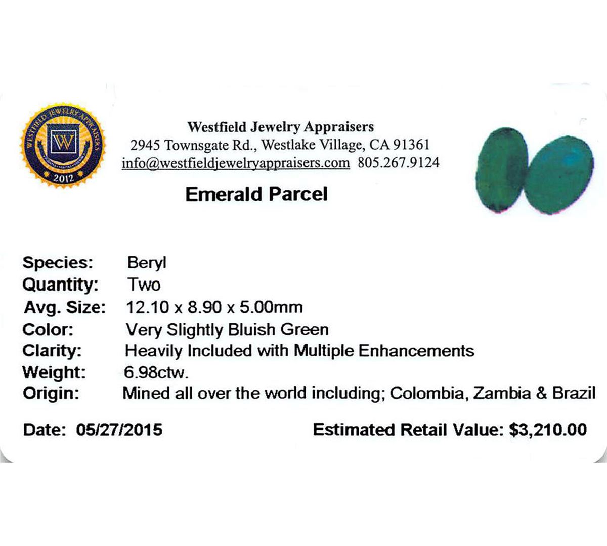 Two oval mixed cut natural emeralds, measuring 12.10 x 8.90 x 5.00mm, exact total weight 6.98ct., clarity is heavily included, medium dark, very slightly grayish, very slightly bluish green color, (GIA vslbG 6/3), cut is good. Transmitting light somewhat diffusely, translucent, Naturally occurring internal & external characteristics are present, Indications of multiple laboratory enhancements, including high temperature heat treatment. Westfield Appraised at $3,210.00.