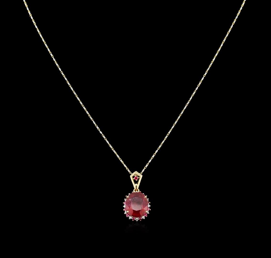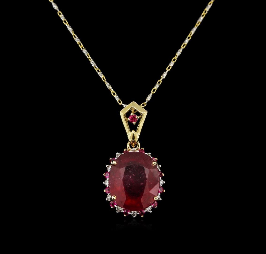 Fourteen karat (14K) two tone gold ruby and diamond pendant. An oval cut ruby corundum gemstone is prong mounted in the center of the pendant. Round brilliant cut diamonds and round cut ruby gemstones accent the pendant around the center gemstone and on the top bail. The pendant is cast stamped "14K" and has a gross weight of 5.2 Grams. Diamond(s): Shape: Round Brilliant Cut. Weight: 0.16 carat. Average Clarity: I1. Average Color: H-J. Symmetry: Very Good. Polish: Very Good. Gemstone(s): Gemstone: Ruby Corundum. Nature: Natural. Shape: Oval and Round, Faceted. Weight: 6.98 carat total. Center Gemstone Dimensions: Length- 12.54 mm. ; Width- 10.73 mm. Bulge: Visible. Clarity: I1, Type 2. Color: Red (5/5). Symmetry: Very Good. Color Intensity: Medium. Transparency: Transparent. Tone: Dark. Enhancements: Indications of high temperature heat treatment, with glass and flux additives. Metal(s): Metal: Gold, Stamped. Purity: 14K. Color: Two Tone. Condition: Excellent. Finish: High polish. GGA Appraised at $3,738.00.