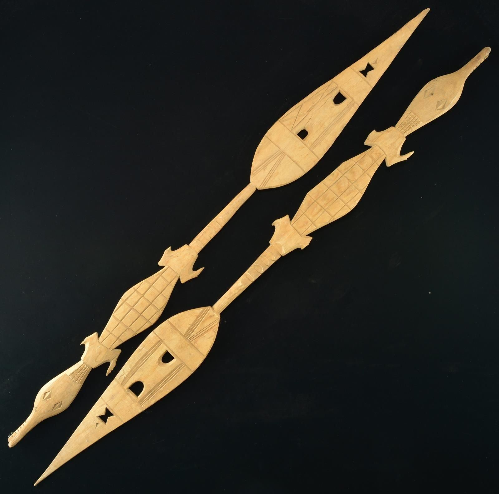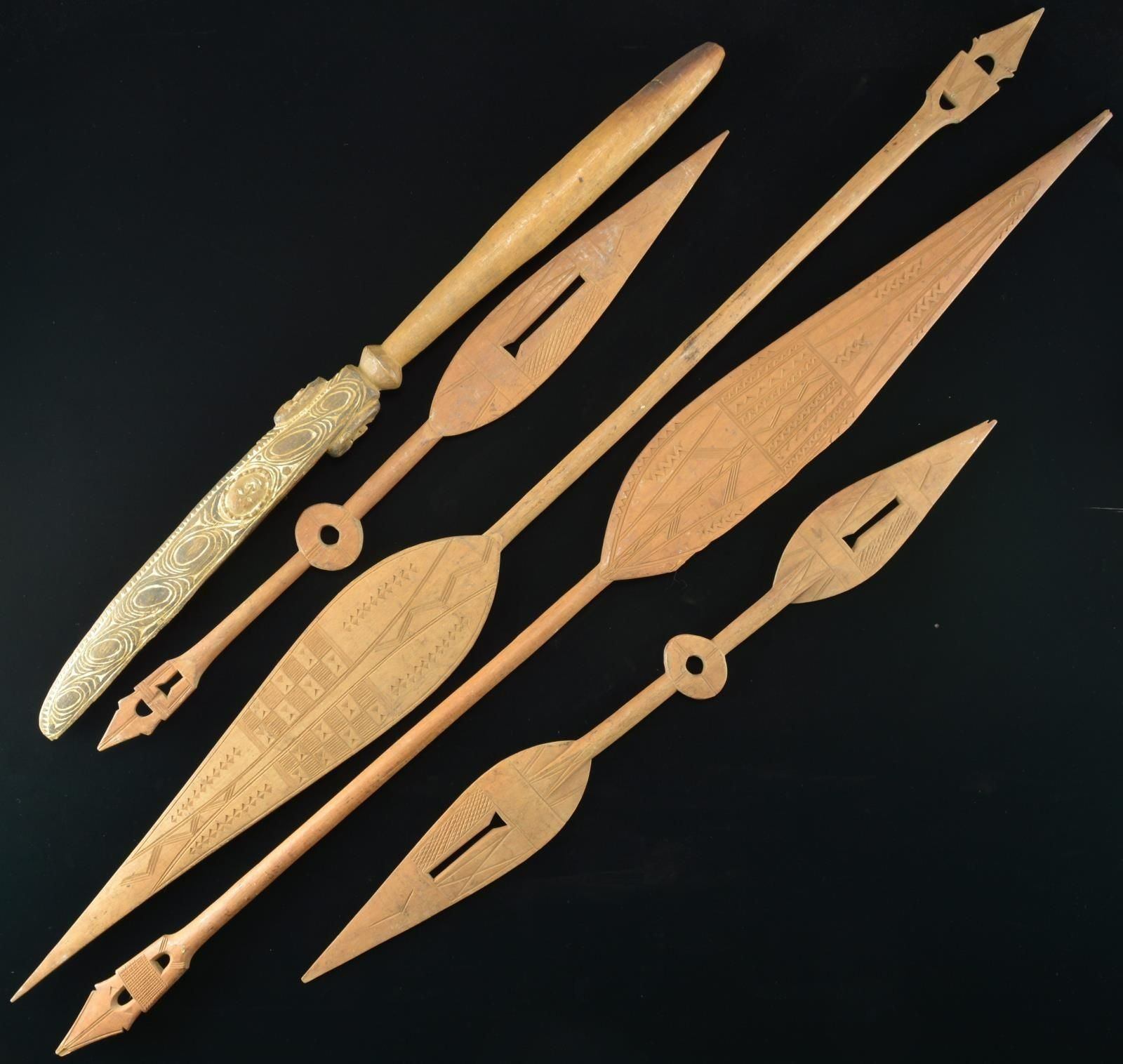 1) This wooden paddle has an overall length of 57 1/2" & a paddle length of 27 1/4". Both paddle & hand hold are intricately carved. 2) This wooden paddle has an overall length of 51 1/2" & a paddle length of 20 3/4". Paddle has 3 carved piercings & other lineal carved decoration. Most of the shaft & the hand hold are carved in the shape of an alligator with an open mouth. 3) This wooden paddle has an overall length of 35 3/4". It has a paddle length of 11" on one end & a paddle length of 15 1/4" on the other end. Both paddles have simple lineal & geometric carvings. The center of the shaft has a 3" oval with a central piercing. 4) This wooden paddle has an overall length of 54" & a paddle length of 22 1/4". Paddle has 3 carved piercings & other lineal carved decoration. Most of the shaft & the hand hold are carved in the shape of an alligator with an open mouth. 5) This wooden paddle has an overall length of 56 5/8" & a paddle length of 26 1/2". Paddle has very intricately carved geometric motifs throughout & the hand hold also has carved decorative motifs. Paddle has some loss of wood on 1 side. 6) This wooden paddle has an overall length of 35". It has a paddle length of 16 1/2". The paddle has lineal carvings with a 4" central piercing. The hand hold has simple carvings & 2 piercings. The center of the shaft has a 2 7/8" oval with a central piercing. 7) A wooden club measuring 38 1/4". The 2 handed grip measures 18 1/4". The carved "blade" is carved with fanciful circular motifs & a human face on each side & at the base of the "edge". CONDITION: all items show light to moderate wear except as noted. Most of the paddle tips show slight chipping. (02-17584/BF). $300-500.