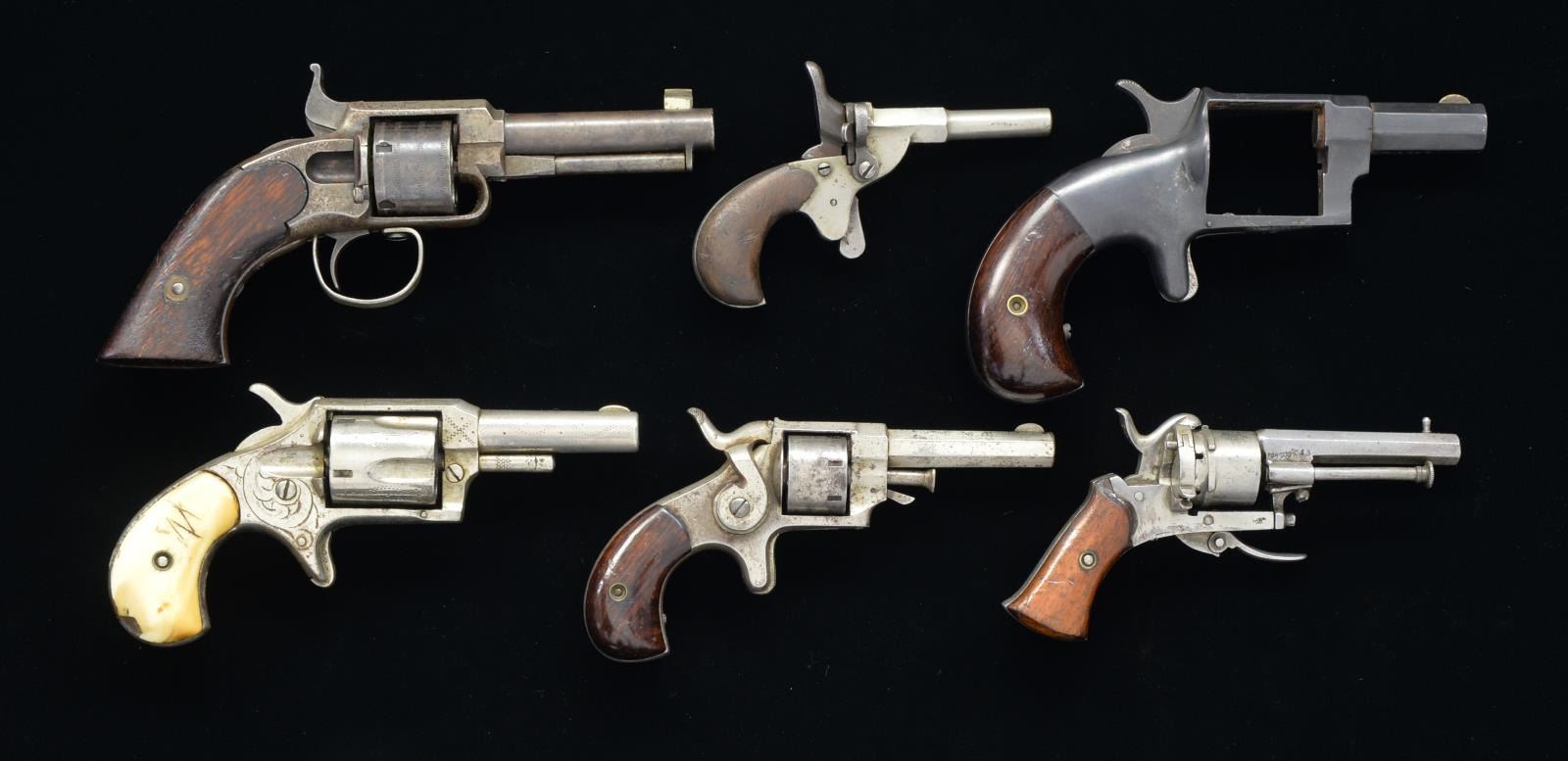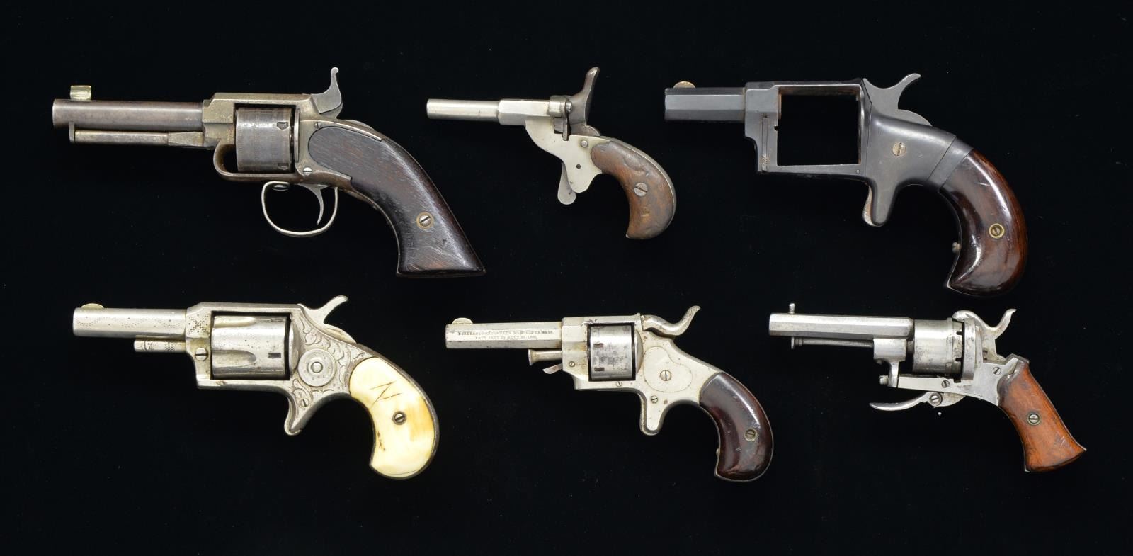 1) JAMES WARNER POCKET REVOLVER. Cal. 30 RF. S# 2099. Bbl. 3" rnd. w/ replacement blade sight. 5 Shot rnd. cyl. Nickel plated action w/ 2 piece walnut grips. CONDITION: metal retains 30% dull worn finish fading to brown showing sm. spots of light pitting. Grips show heavy wear & handling marks. Cyl. does not properly rotate when action is cycled. Bore is dark w/ spots of pitting over largely intact rifling. (01-17112/DS). 2) UNMARKED STARTER PISTOL. Cal. 22 Short. S# 41. Overall length 4 1/2". Single shot design w/ firing pin on hammer, spur trigger, breech flat rolls to left for loading. Nickel finish. 1 Piece walnut grips. CONDITION: 80% dull nickel. Grips show heavy wear & marks. Hammer is reluctant to hold in cocked position. (01-17132/DS). 3) BELGIUM FOLDING TRIGGER PINFIRE REVOLVER. Cal. 5mm Pinfire. S# 13. Bbl. 2 3/8" oct. 6 shot rnd. cyl. Folding trigger. Nickel finish. 2 Piece walnut grips. CONDITION: 30% nickel. Action does not function properly. Grips show heavy wear. Heavily pitted bore. (01-17133/DS). 4) FOREHAND & WADSWORTH SIDE HAMMER REVOLVER. Cal. 22 RF. S# 28019. Bbl. 2 3/8" oct. Semi circular sight. 7 Shot rnd. cyl. Action features side mounted hammer & spur trigger. Full nickel finish. 2 Piece bird's head rosewood grips. CONDITION: 50% nickel showing spots of corrosion & pitting. Grips show heavy wear & handling marks. Pitted bore. (01-17135/DS) 5) HOPKINS & ALLEN XL. No. 4. N.Y. SA REVOLVER. Cal. 38 RF. NSN. Bbl. 2" oct. Spur trigger. 2 Piece rosewood grips. CONDITION: cyl. assembly is missing. Action has dark gray patina. Grips show light wear. Dark pitted bore. 6) RED JACKET NO. 3 SA REVOLER. Cal. 32 RF. NSN. Bbl. 5 Shot fluted cyl. Nickel finished action w/ spur trigger has simple scroll & stamped ornamentation. 2 Piece ivory grips. Left grip panel has hand scratched "N". Right grip panel has hand scratched "M" or "W". CONDITION: 50% nickel. Right grip panel is chipped along backstrap. Action has very stiff trigger pull. Bore retains intact rifling w/ spots of pitting. (01-17149(2)/DS). ALL ANTIQUE. $700-1,000.