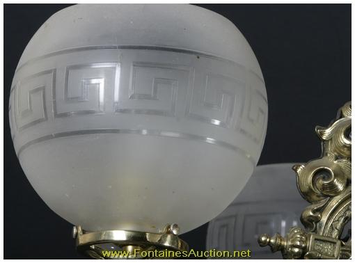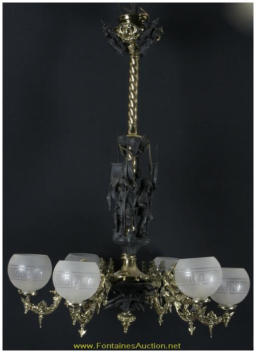 Attr. Cornelius Figural 6 Arm Chandelier. 2 tone bronze chandelier with 3 figural armored soldiers on the main shaft holding flags, 6 fancy molded arms with gas cocks at the bottom, frosted Greek Key globes, 3 armored suits at the bottom with gilt medallions in between; electrified; in excellent condition. 38"W x 58"H x 38"D. Estimated Value$5,000 - 7,500.