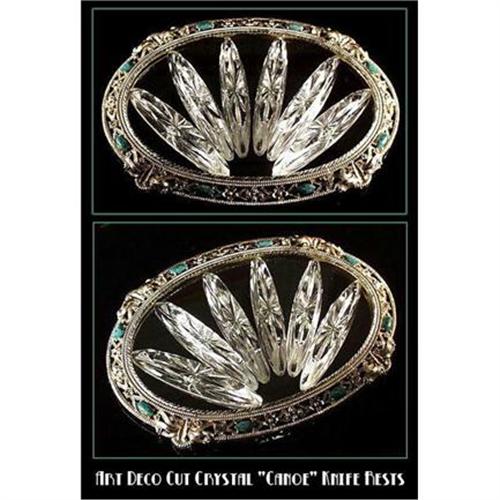 If you are REALLY interested in this item, please note that for Ebay Live Auction only bids at or above $90 will be successful and meet our reserve. Beautiful, unusual set of six (6) crystal knife rests from the Art Deco period of 1930's. The knife rest is 3-3/4" long, in a "Canoe" shape, the base is hand cut in a "Starburst" design. The base edges are carefully finished on a grinding wheel. Overall condition is very good, there is some roughness and minor nicks around the base, which can be easily polished off, if desired. Photos for Ebay Live Auctions are automaticaly reduced, so if you want to see larger, more detailed pictures, email us.