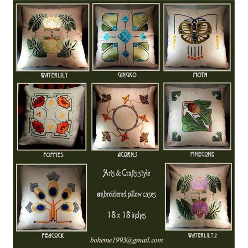Our exclusive - not available by any other seller, Gallery or Studio. Outstanding Arts & Crafts / Mission style decorative pillow cases in 8 different styles / patterns. These pillows will immediately enhance the character and charm of any room in which it is placed. Each design was hand drawn, hand traced and embroidered on an old Singer sewing machine, using what I believe is called "lock stitch". This type of embroidery will not run, like "straight" stitch. There is no (much less expensive) stenciling or appliqué used in this process. Each pillow is 18" x 18" and embroidered on a fine canvas linen. The (more expensive) addition of a zipper on one seam allows for each owner to independently choose their own filling, while also making cleaning far easier. No Arts & Crafts home is complete without the addition of fine pillows. Please note that this auction is for the pillow cases only. Pictured is 8 styles, but only following are available - Poppies #1, Ginkgo #2, Peacock #3, Moth #4, Mauve Waterlily #8 and Acorns #17. You are buying 6 pillow cases of your choice - mix or match. Comparables are offered at Galleries or Studios in the price range of $150-$250 per pillow.