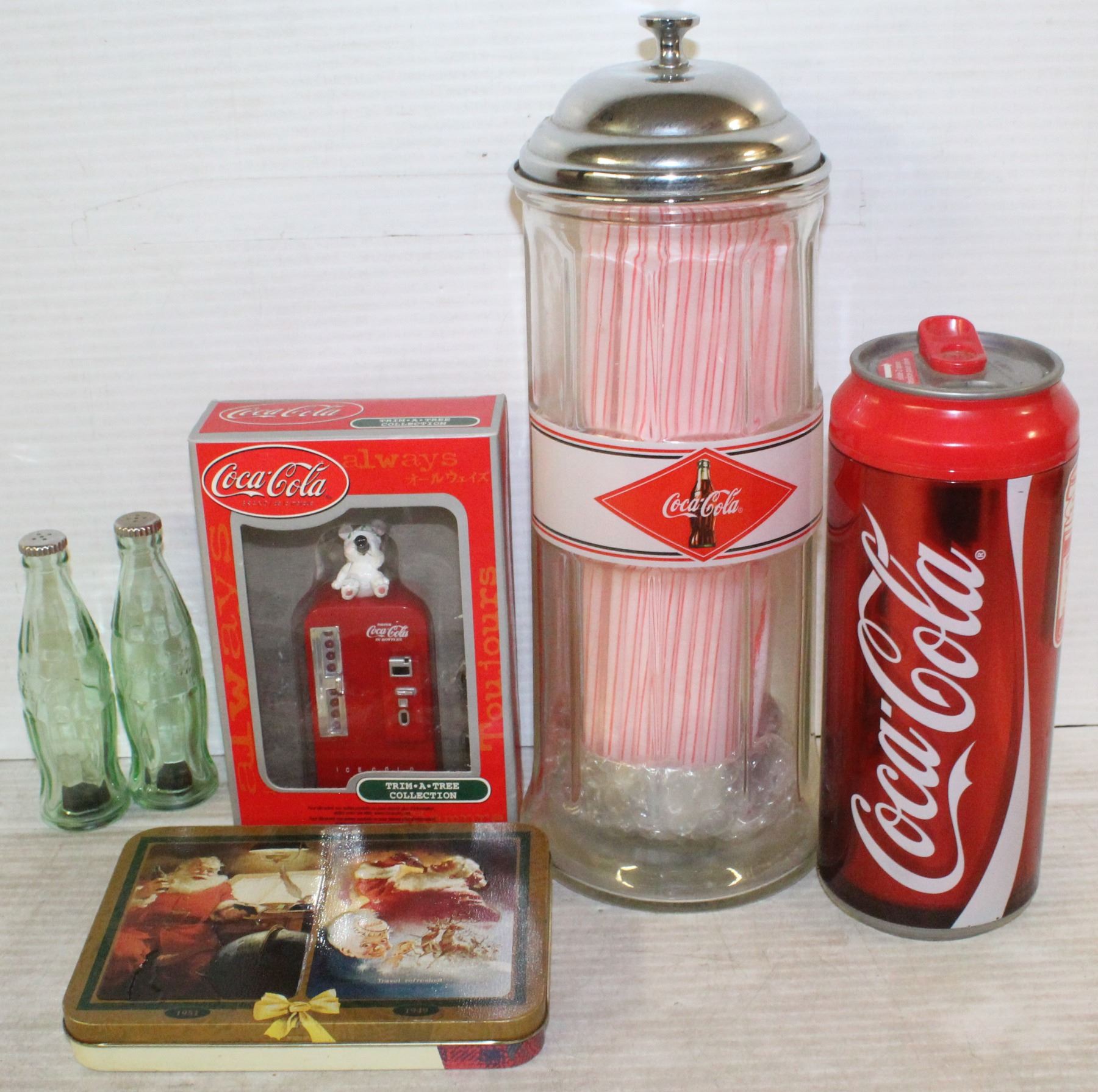 STRAW DISPENSER, TIN CONTAINER, ORNAMENT, 2 SMALL GLASS BOTTLES, BOTTLE