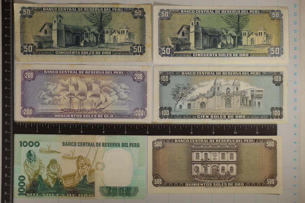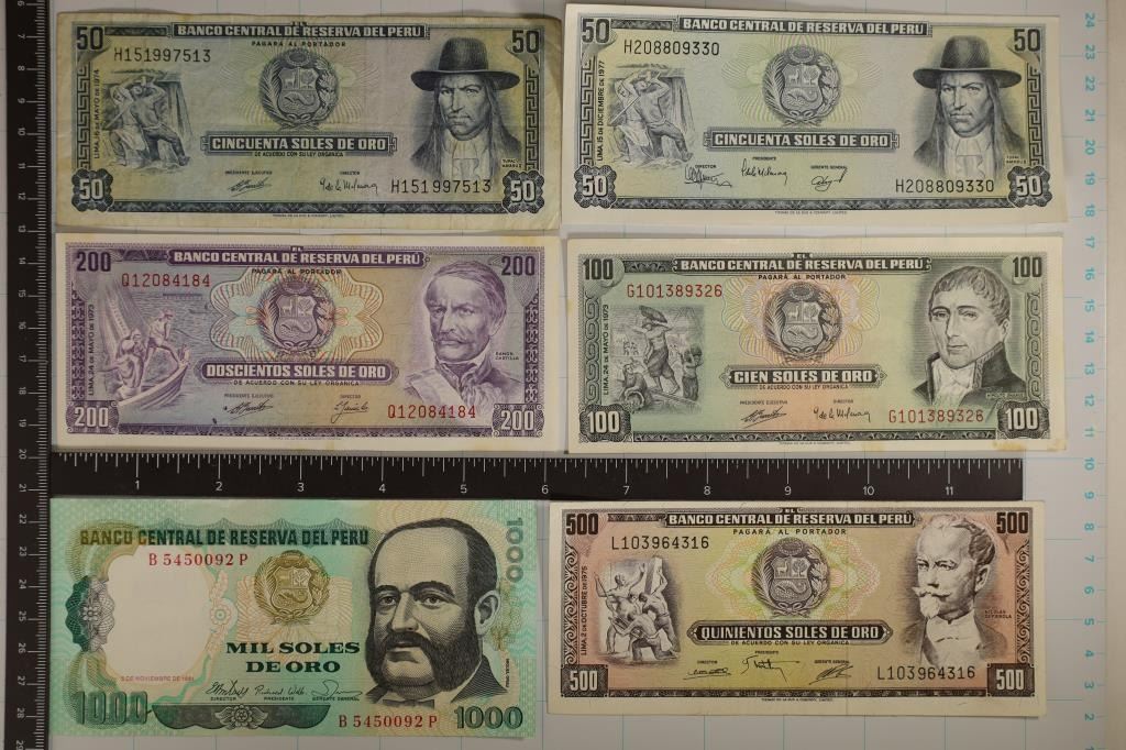 1973-100 SOLES (CRISP), 1973-200 SOLES (CRISP) 1975-500 SOLES (CRISP) AND 1981-1000 SOLES. A FEW LIGHT STAINS NOTED ON NOTES
