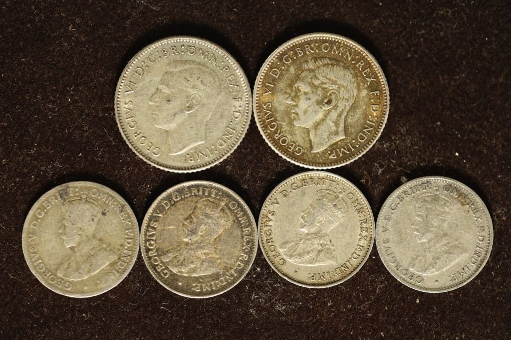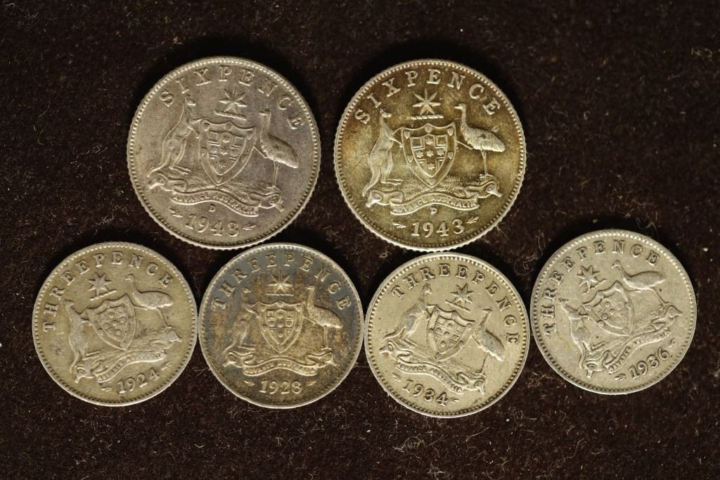 1928, 1934 & 1936) AND 2-1943-D'S SIX PENCE. .3256 OZ. ASW TOTAL