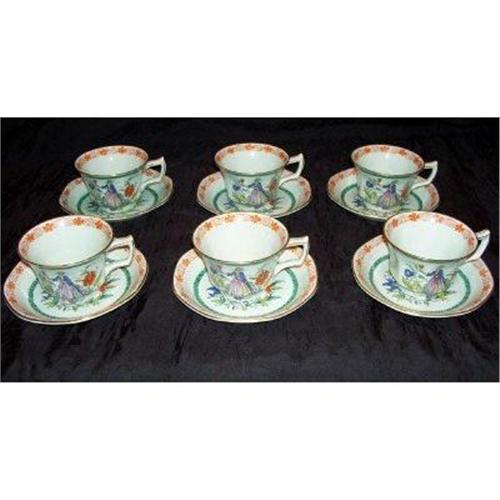 Pleased to offer this set of six cups and saucers by Adams of England. I have a large number of pieces in this pattern that I acquired at a recent estate sale. The pattern is called "The Piper" and has hand painted enamel decorating. Calyx Ware by Adams has well distinguished characteristics such as hand-enamelled colours on a greenish porcelain glaze. The dinner plates from this pattern are marked with a history of the Piper on the backs that reads: " A Copy of a pattern brought out when enameling in colours was first introduced in Staffordshire in or about 1755-1760, And is typical of the patterns made by the William Adams of that period"