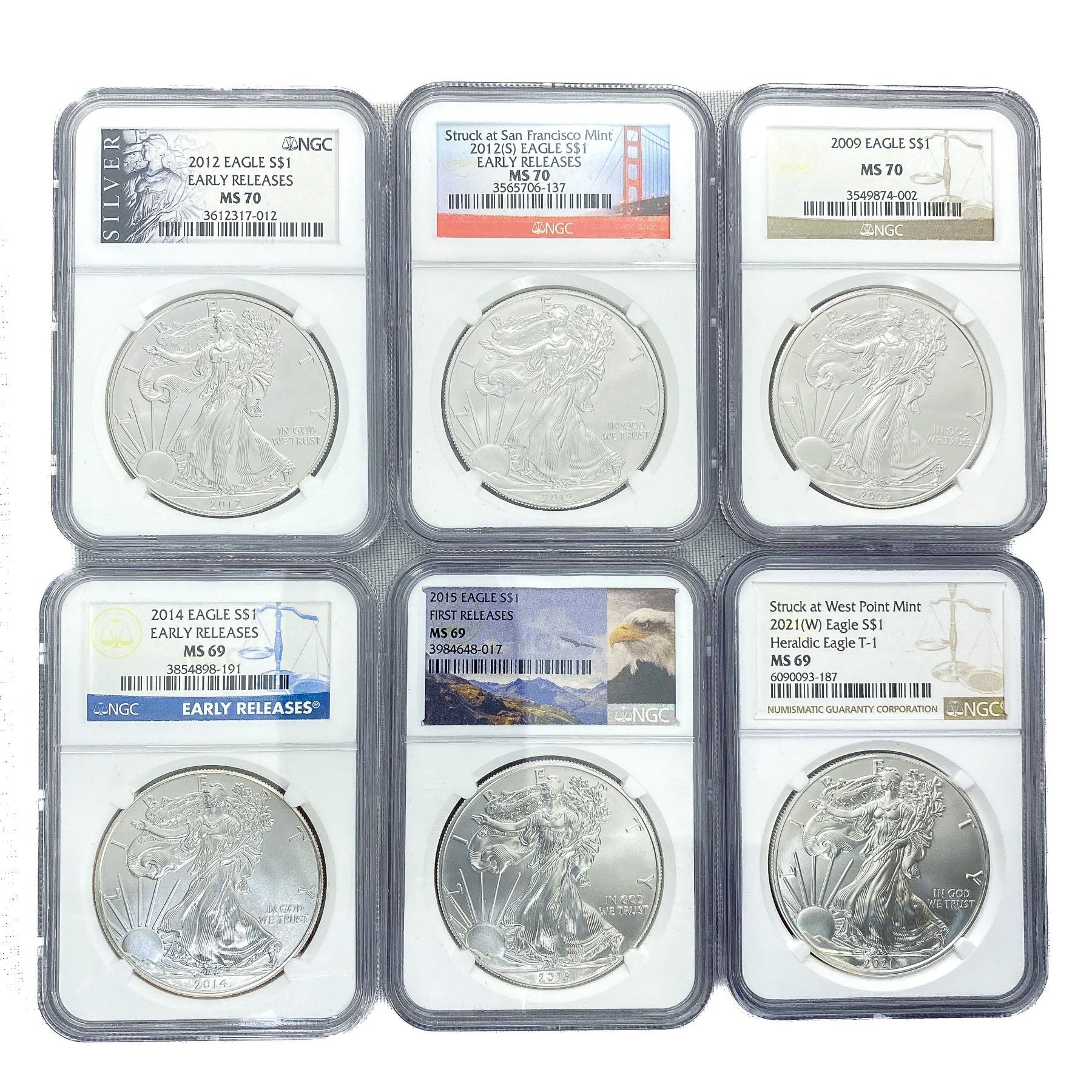 (6) American 1oz Silver Eagles NGC MS69/70 (2009,