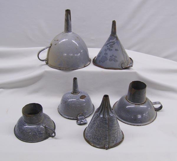6 Antique Graniteware Funnels. The largest measures approx. 7''Tall x 6 1/4''Diameter. Buyers Pay Actual Shipping and Handling Charges(see terms and conditions for more information).