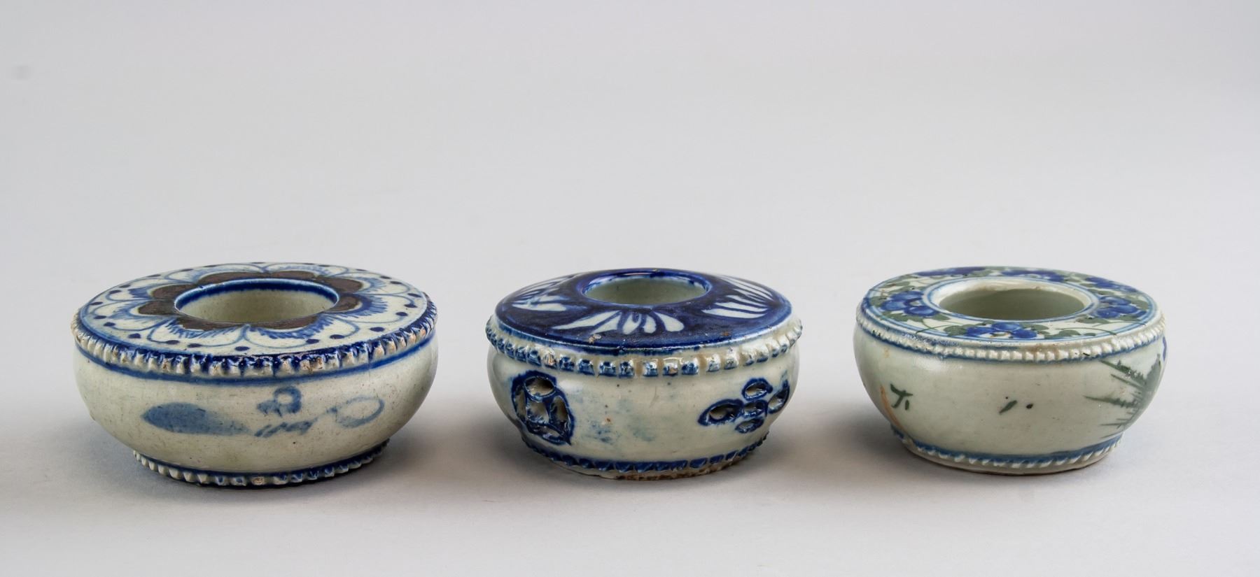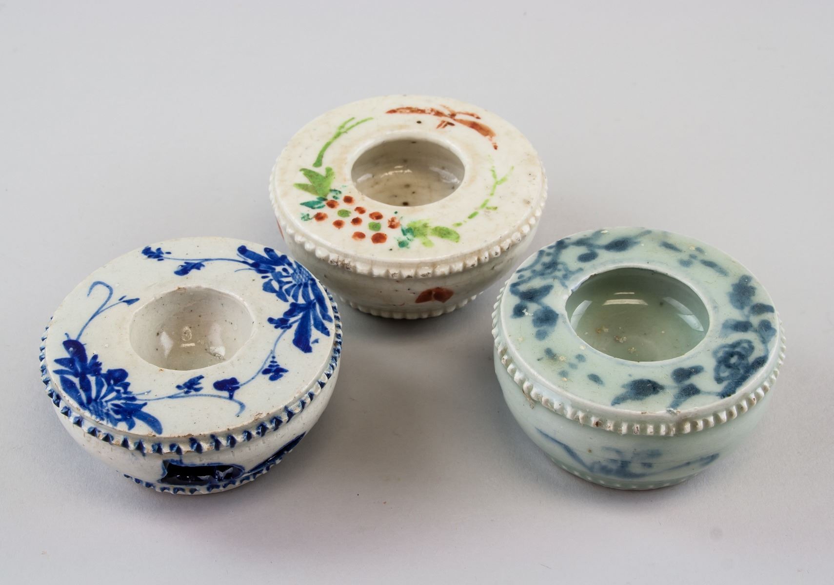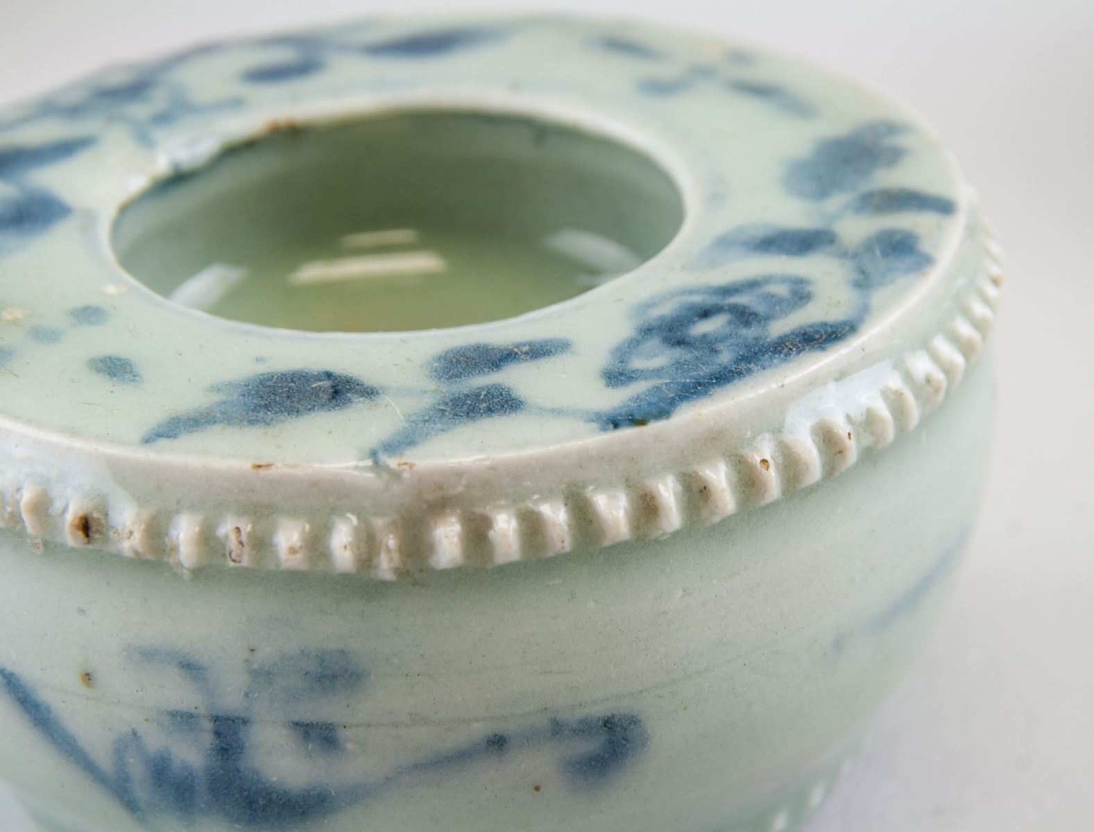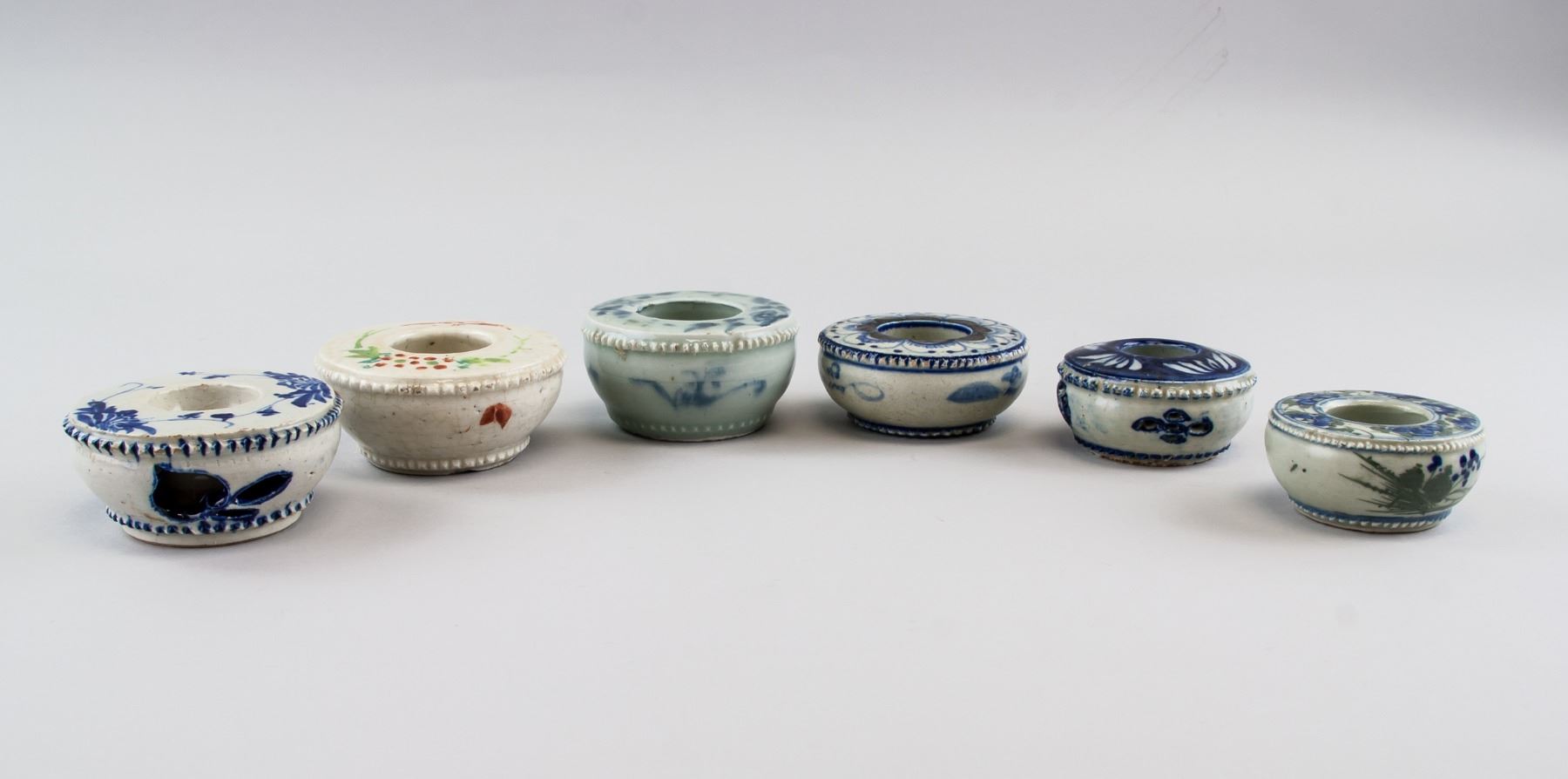 Six (6) assorted Chinese porcelain water pots, six (6) blue and white, one (1) famille rose, painted with fruits and plants, 3.5-4 x 8-10 cm, 2 kg total