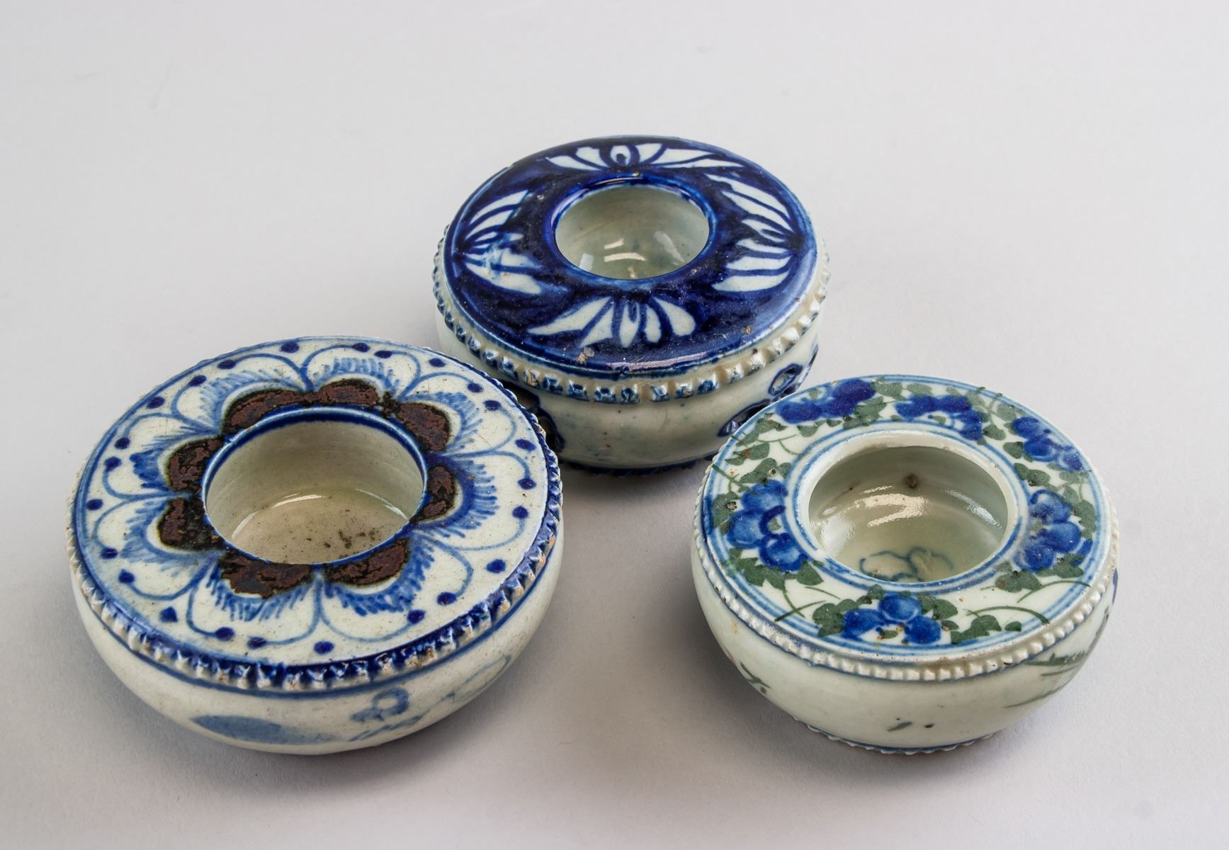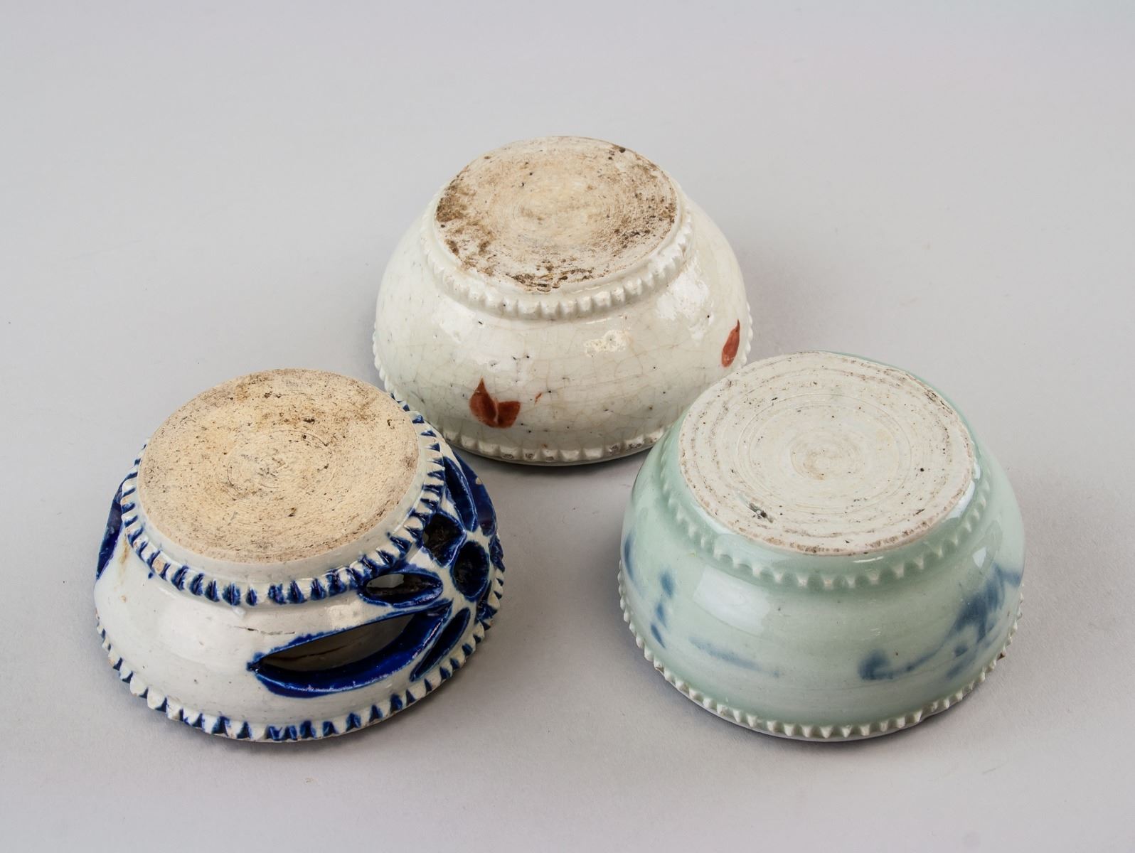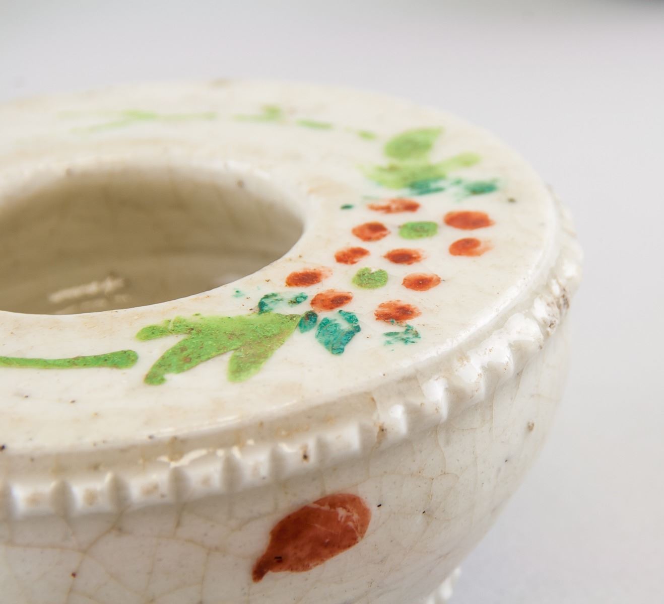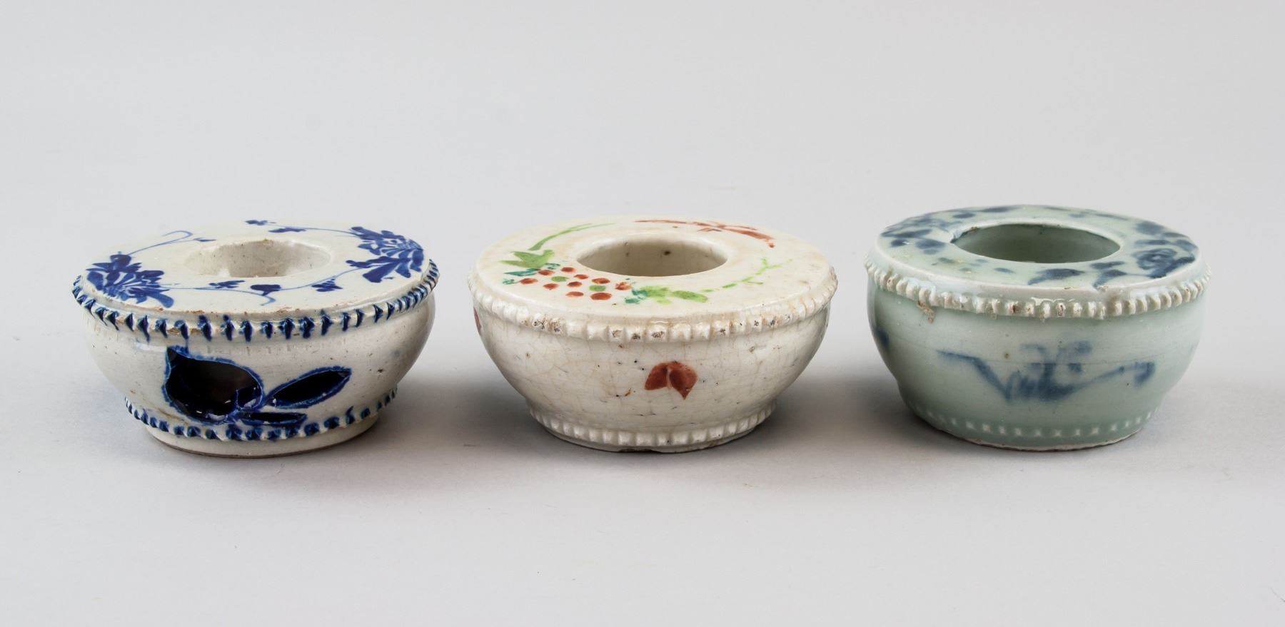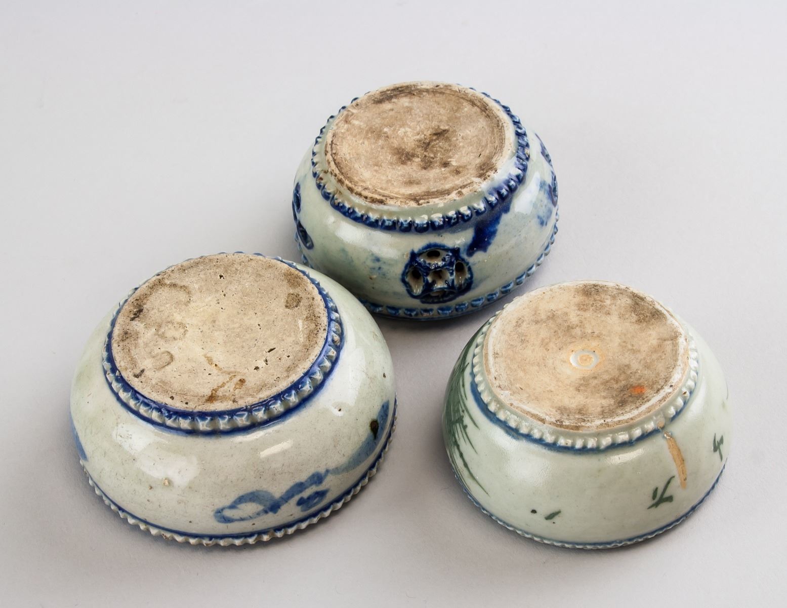 Six (6) assorted Chinese porcelain water pots, six (6) blue and white, one (1) famille rose, painted with fruits and plants, 3.5-4 x 8-10 cm, 2 kg total