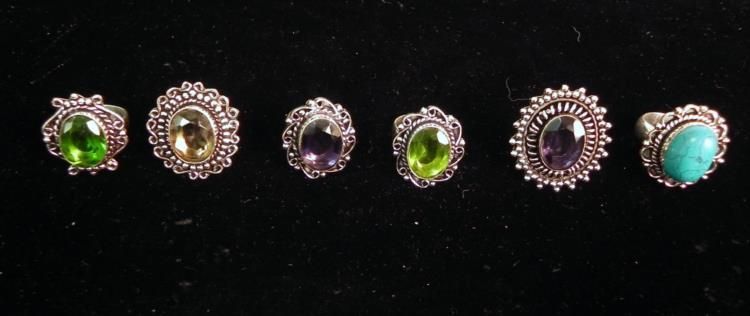 Offered here are 6 assorted German Silver Rings. Four are size 9 and two are size 7. The stones are 2 amethyst, 2 peridot, a smoky quartz, and a turquoise.
