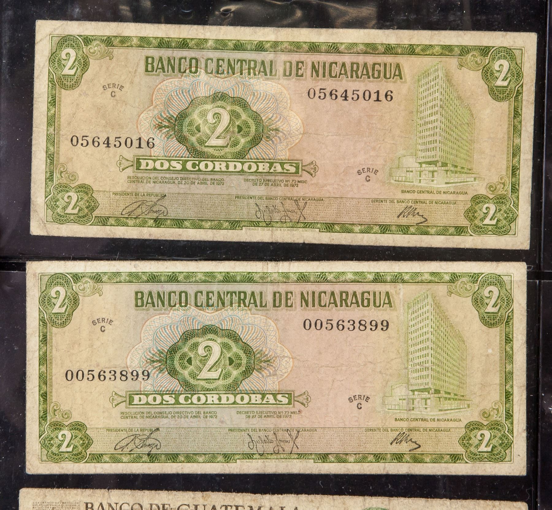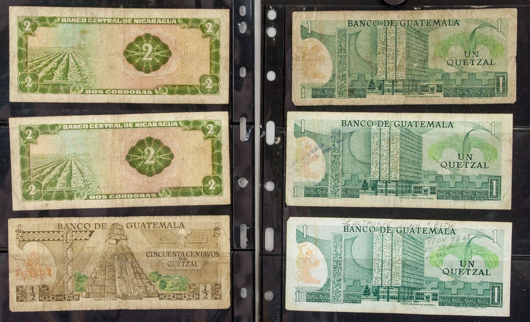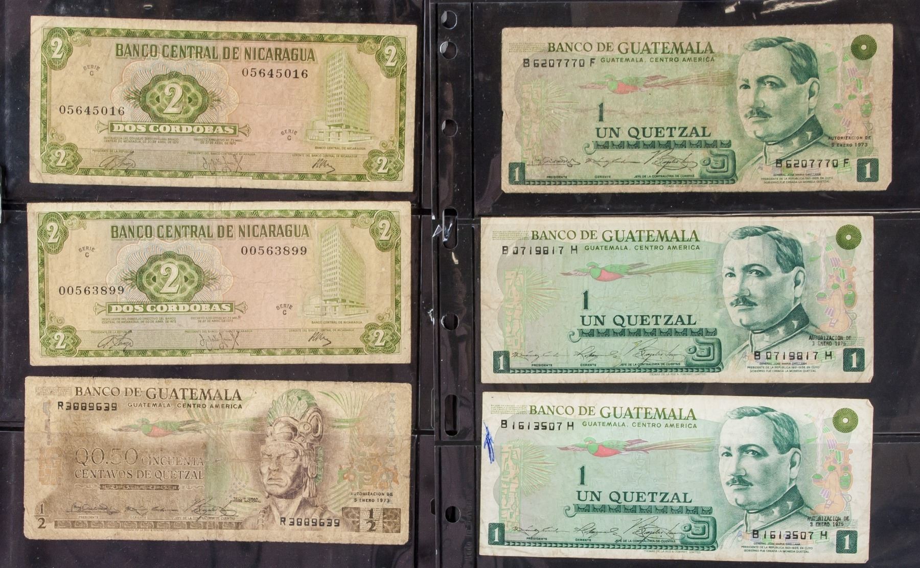 Six assorted banknotes, 2 1972 Nicaraguan Dos Cordobas, 1 1973 Guatemalan 0.5 Cincuenta, 3 1973-1975 Guatemalan Un Quetzal and . Authorization date printed on the banknotes, 6.5 x 15.5 cm. PROVENANCE: Private collection (Alberta, ON)