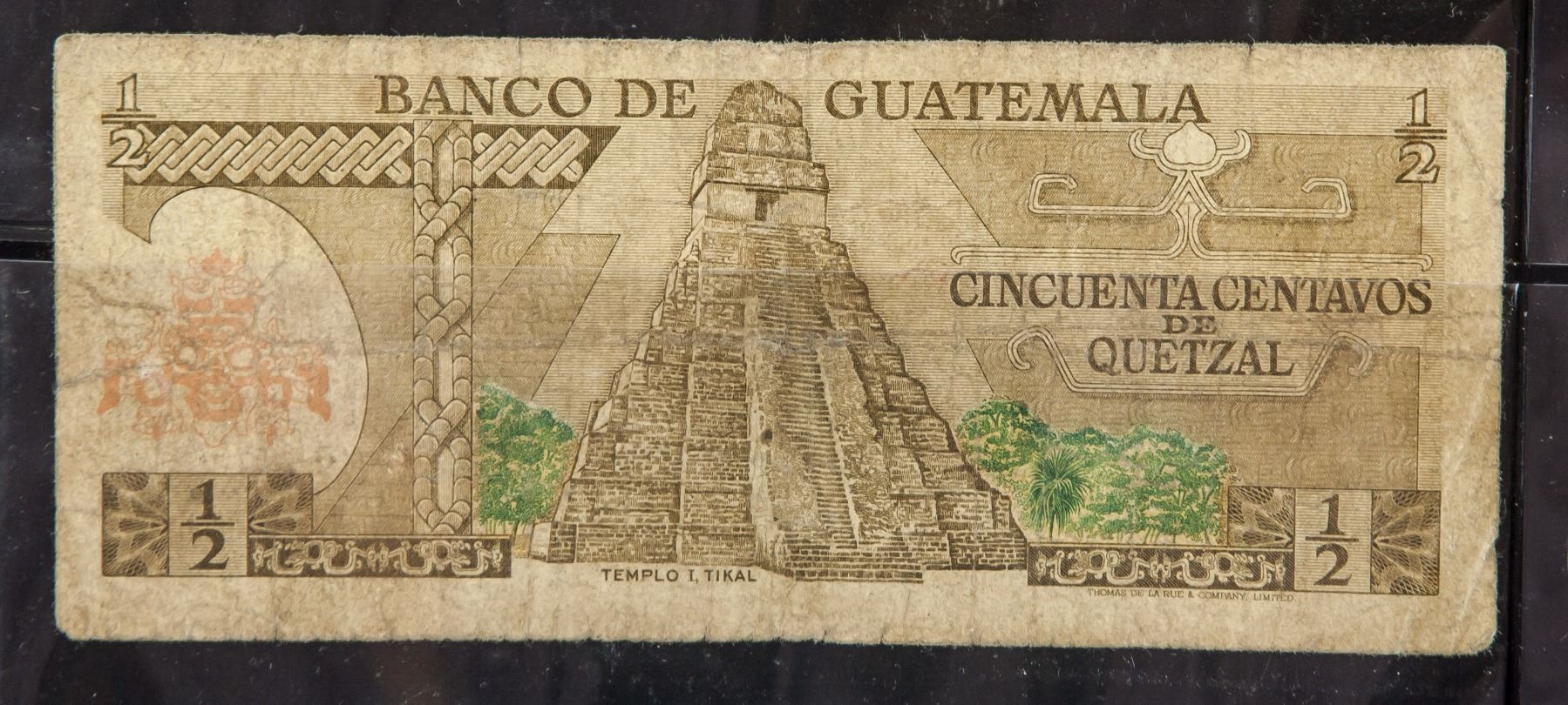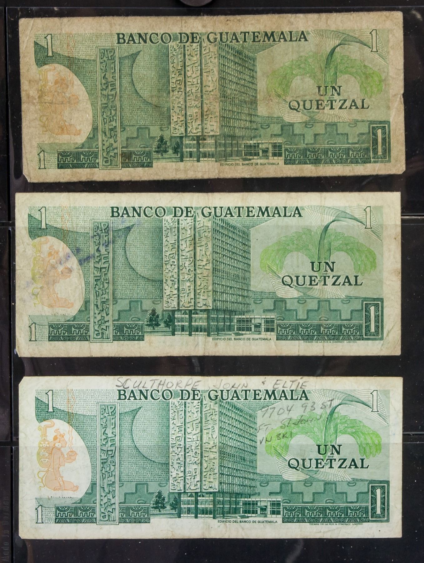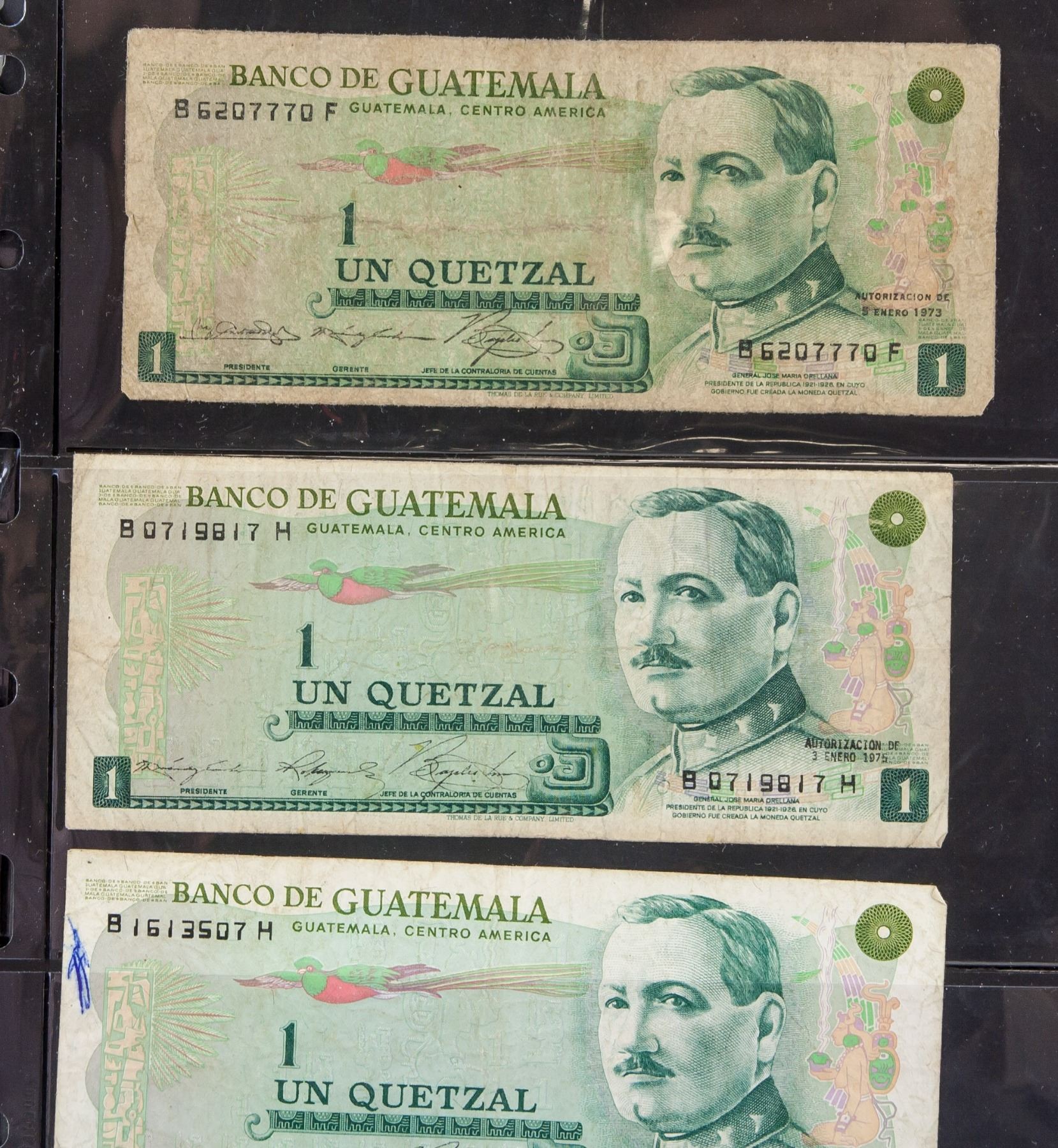 Six assorted banknotes, 2 1972 Nicaraguan Dos Cordobas, 1 1973 Guatemalan 0.5 Cincuenta, 3 1973-1975 Guatemalan Un Quetzal and . Authorization date printed on the banknotes, 6.5 x 15.5 cm. PROVENANCE: Private collection (Alberta, ON)