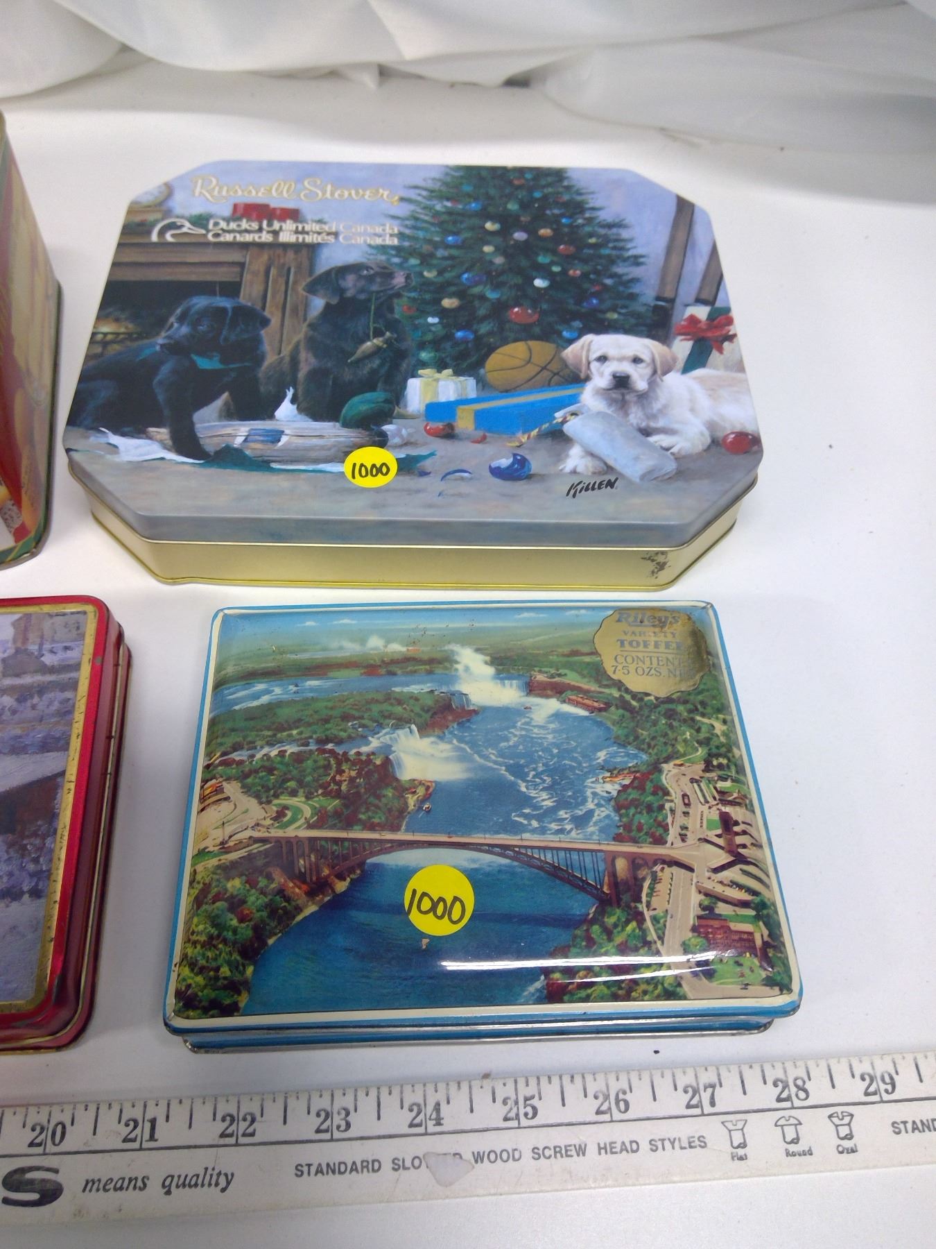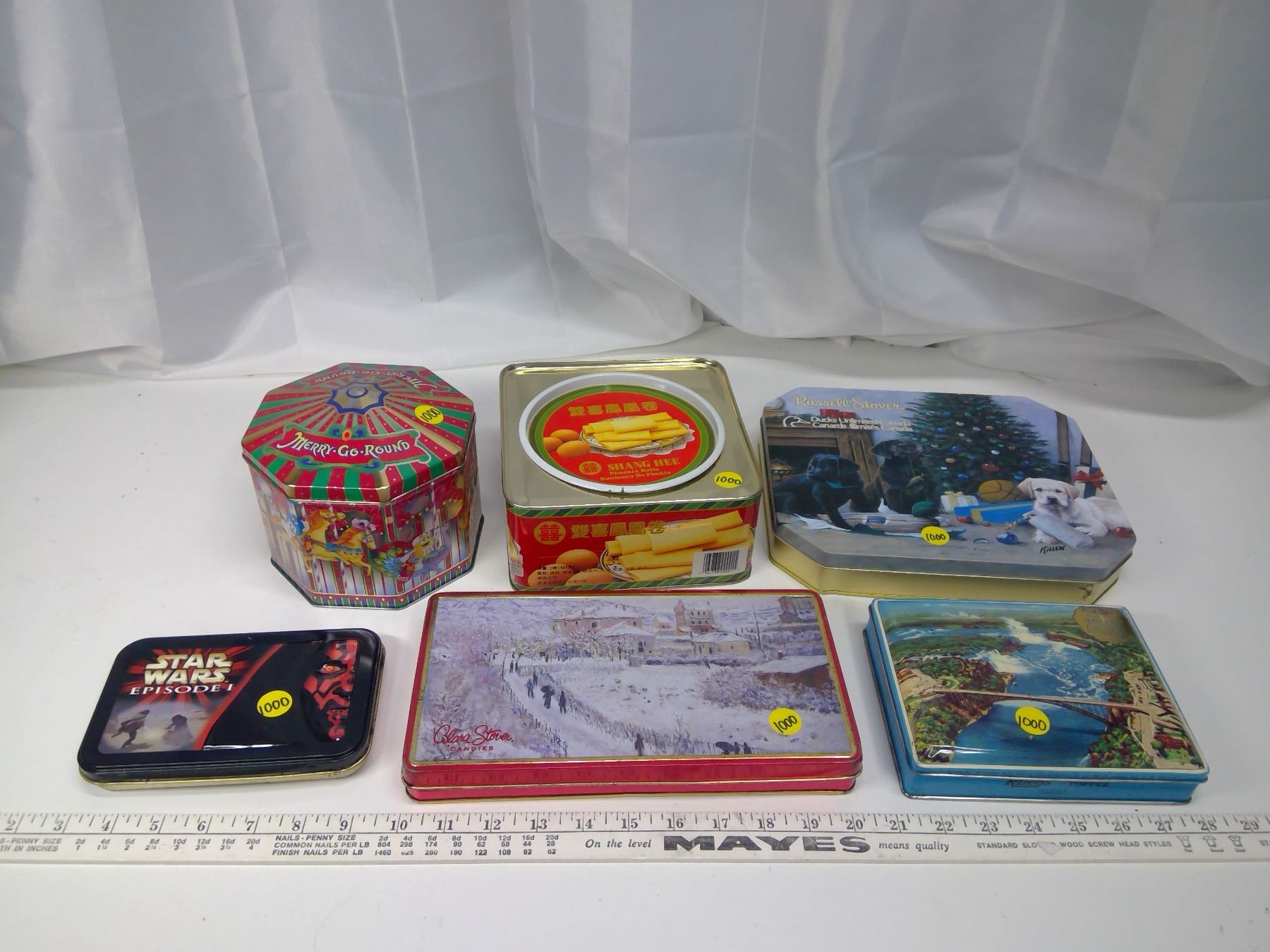 6 Assorted Tins - M&M, Shang Hee, Russel Stover, Clara Stover, Riley's, and Star Wars