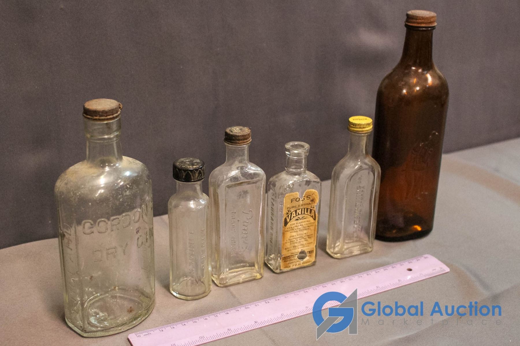 6 Assorted Vintage Glass Bottles ( Gordon's Dry Gin; Pimex; Foss Pure Vanilla Extract; J.R. Watkins,