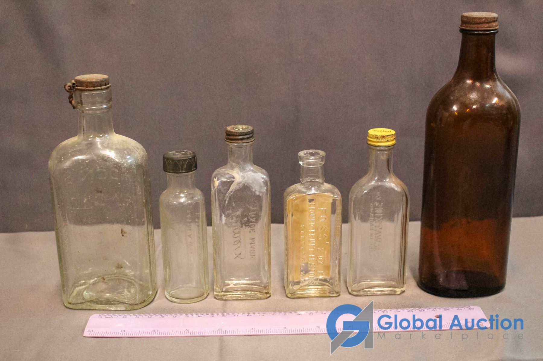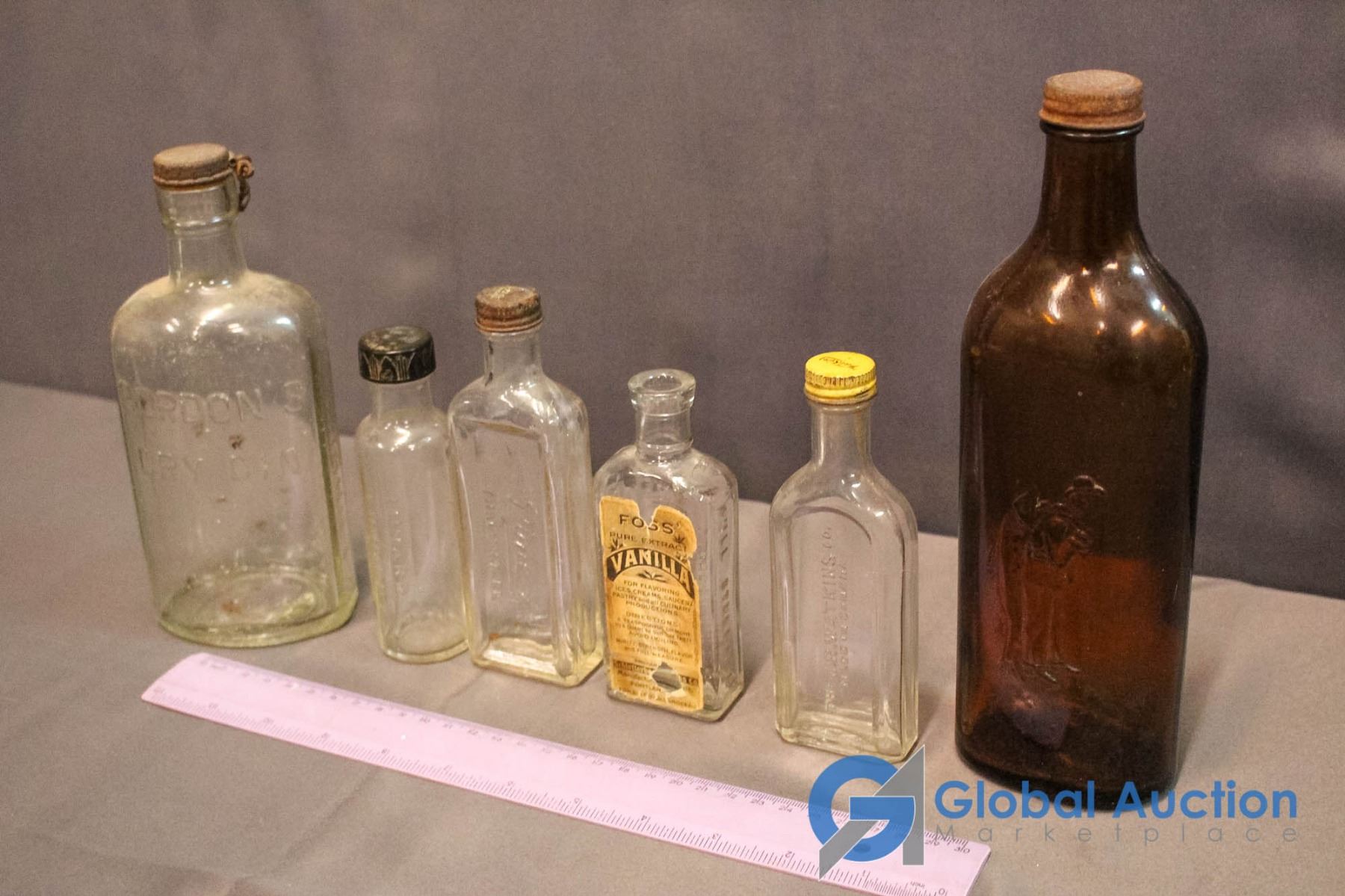 6 Assorted Vintage Glass Bottles ( Gordon's Dry Gin; Pimex; Foss Pure Vanilla Extract; J.R. Watkins, etc)