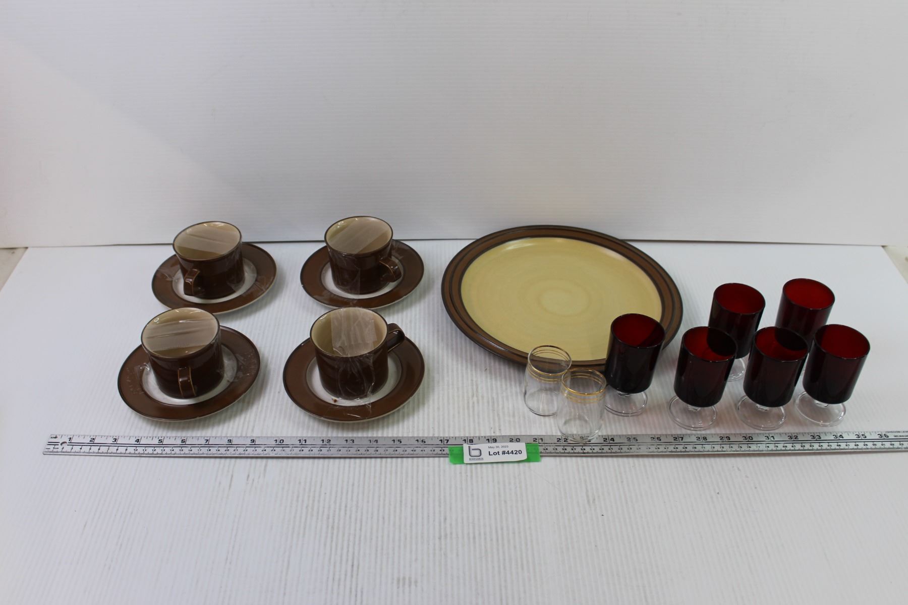 (6) Avon Red Cape Cod Pedestal Mugs+Stoneware Cups and Plates