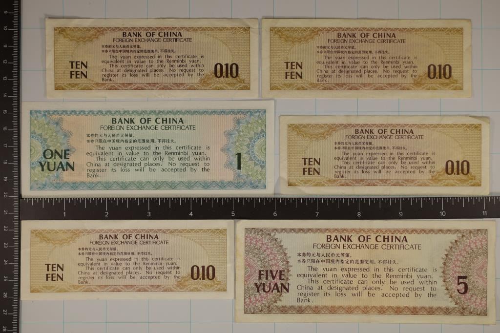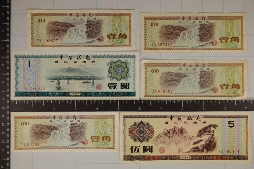 4- .10 FEN, 1- 1 YUAN AND 1- 5 YUAN. STARTED IN 1979 AND WAS USED SOLEY FOR TOURIST AND VISITORS IN CHINA.