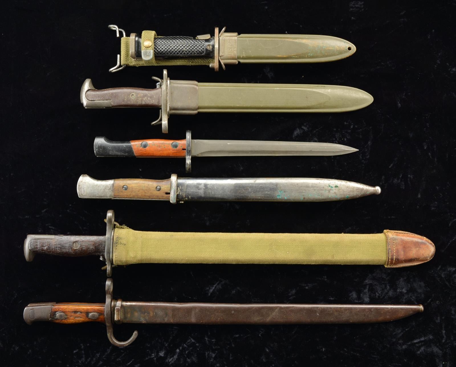 2) 1918 DATED RIA BAYONET & SCABBARD. Blade: 16" w/ WWII parkerized finish; tip has been polished/sharpened. Scabbard has canvas cover w/ leather tip. CONDITION: very good arsenal refurbished blade. Good grips w/ marks. Good scabbard w/ stains & scuffs.