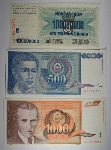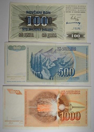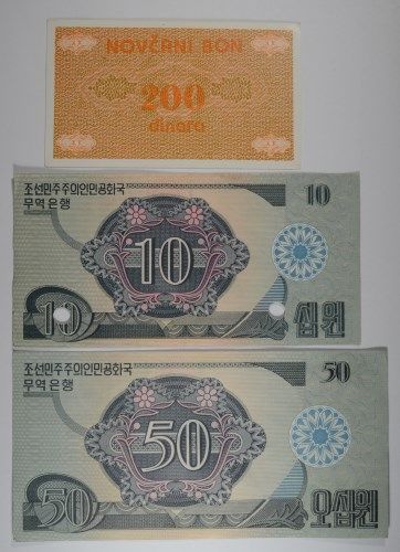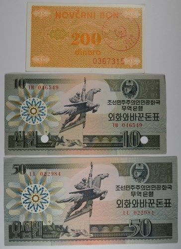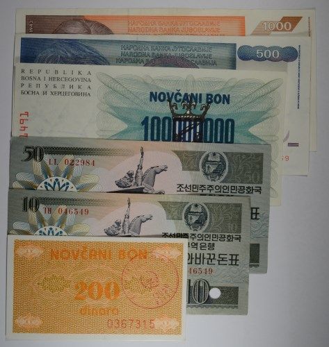 1998 NORTH KOREA 10 WON, UNCIRCULATED, 1988 NORTH KOREA 50 WON, UNCIRCULATED, 1990 YUGOSLAVIA 500 DINARA, UNCIRCULATED, 1990 YUGOSLAVIA 1000 DINARA, UNCIRCULATED, 1992 BOSNIA 200 DINARA, EX, 1993 BOSNIA 100,000,000 DINARA, UNCIRCULATED, ESTIMATE, $60.00 TO $65.00