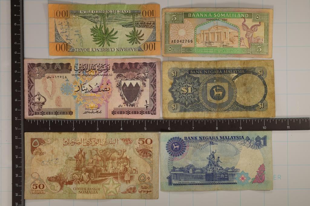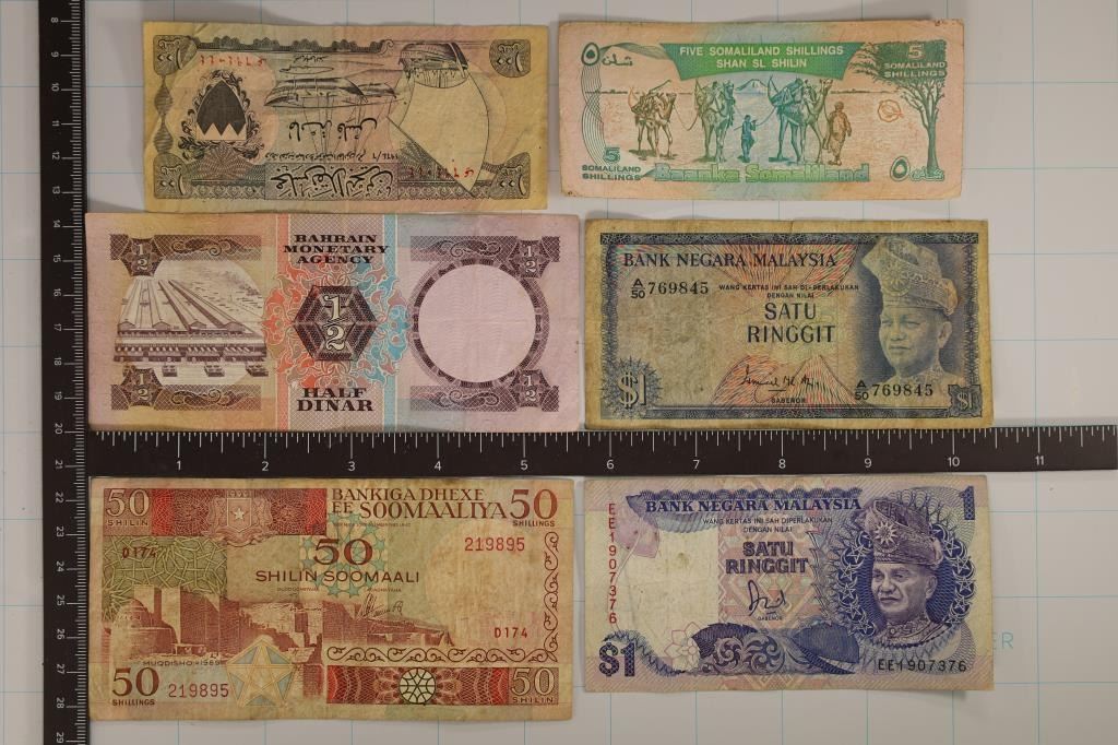 1989 SOMALI 50 SHILIN, 1994 SOMALILAND 5 SHILIN, 2-MALAYSIA 1 RINGGIT AND BAHRAIN 1/2 AND 100 DINAR BILLS