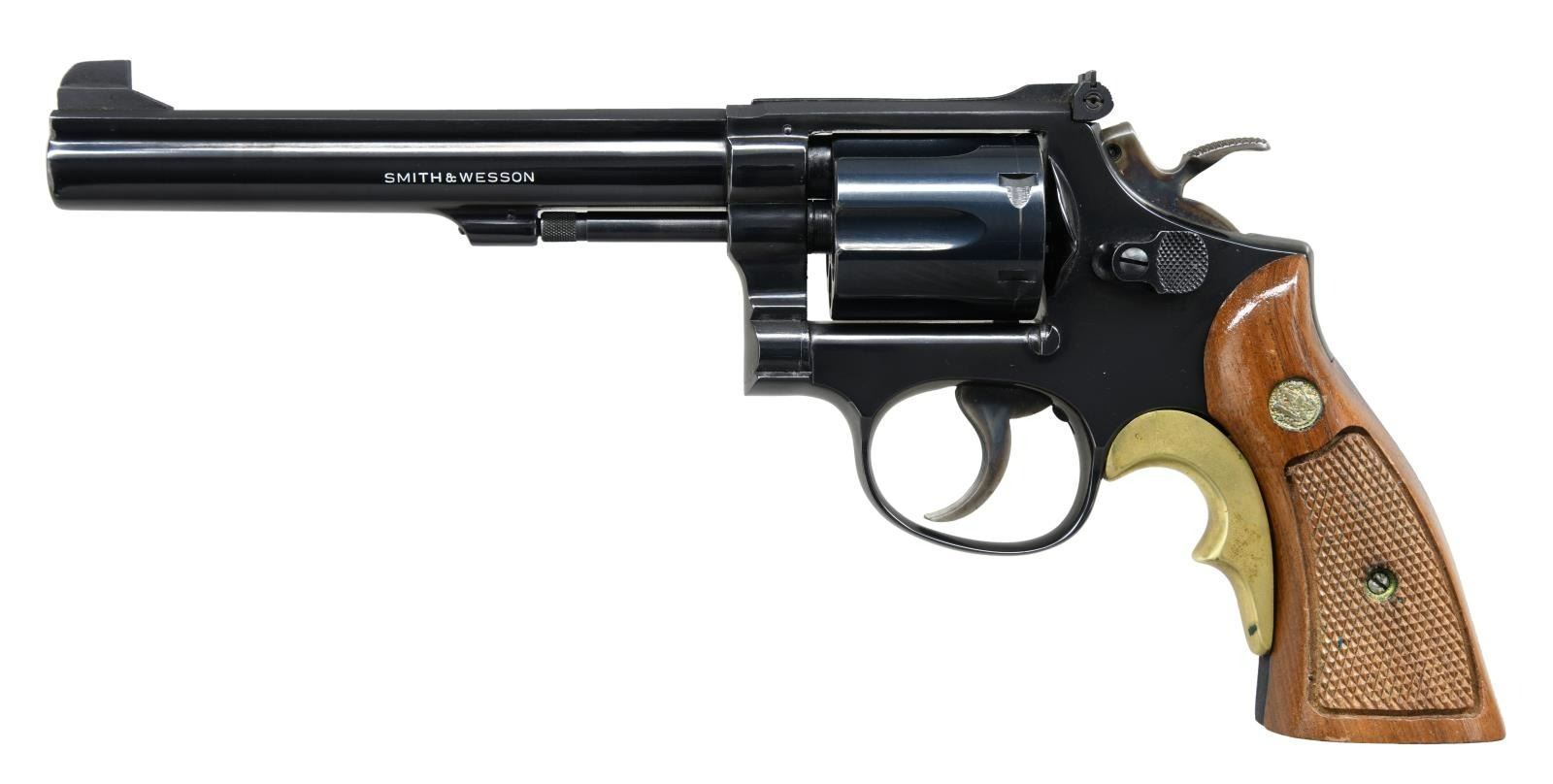 Cal. 38 Spl. S# 1K41430. Bbl. 6". Mfg. 1970. Double action revolver built on the square butt K frame w/ 3 screws. 1/8" Patridge front & black Micrometer click rear sights. 6" pinned & ribbed barrel. Blued finish. 10 groove serrated fore strap & backstrap. .500" checkered target hammer. Serrated trigger. Barrel markings include "Smith & Wesson" on left side and ".38 S&W Special Ctg" on right. Large S&W logo on right sideplate. Exposed ejector rod. Checkered walnut grips w/ gold S&W medallions. CONDITION: Blued finish is complete & consistent w/ full coverage. Some gentle thinning & marking primarily on right sideplate. Light drag line on cylinder. Most factory markings filled white. Grips in very nice condition, demonstrating some light handling, still retaining sharp medallions. Brass spacer w/ finger grooves between grips. Timing appears to be correct. Bright bore w/ strong rifling. (23-2337/JZ). CURIO. $400-700.