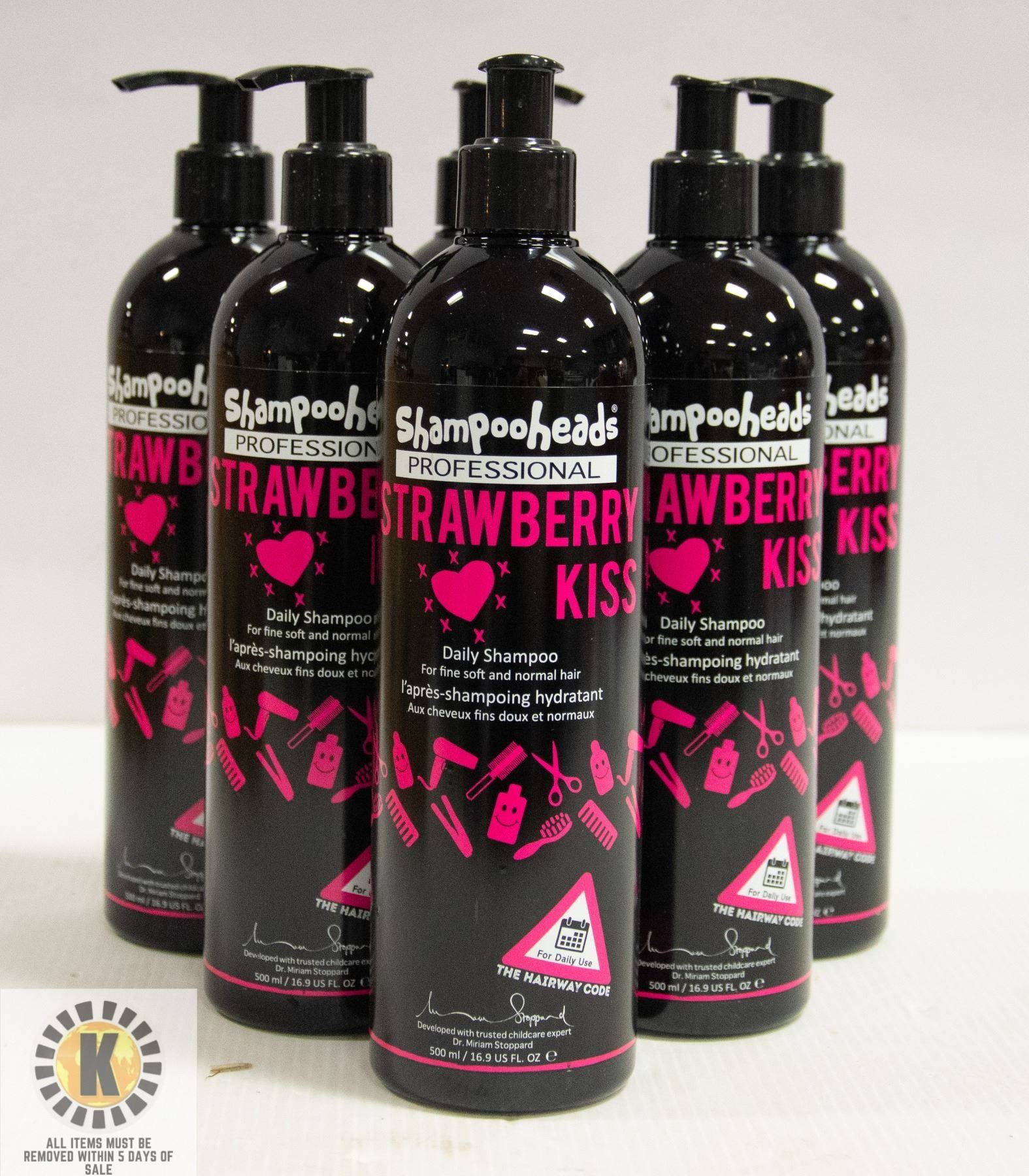 6 BOTTLES OF SHAMPOOHEADS PROFESSIONAL STRAWBERRY KISS DAILY SHAMPOO FOR FINE AND NORMAL HAIR. 500 mL PER BOTTLE. ALL ITEMS MUST BE REMOVED WITHIN 5 DAYS OF SALE