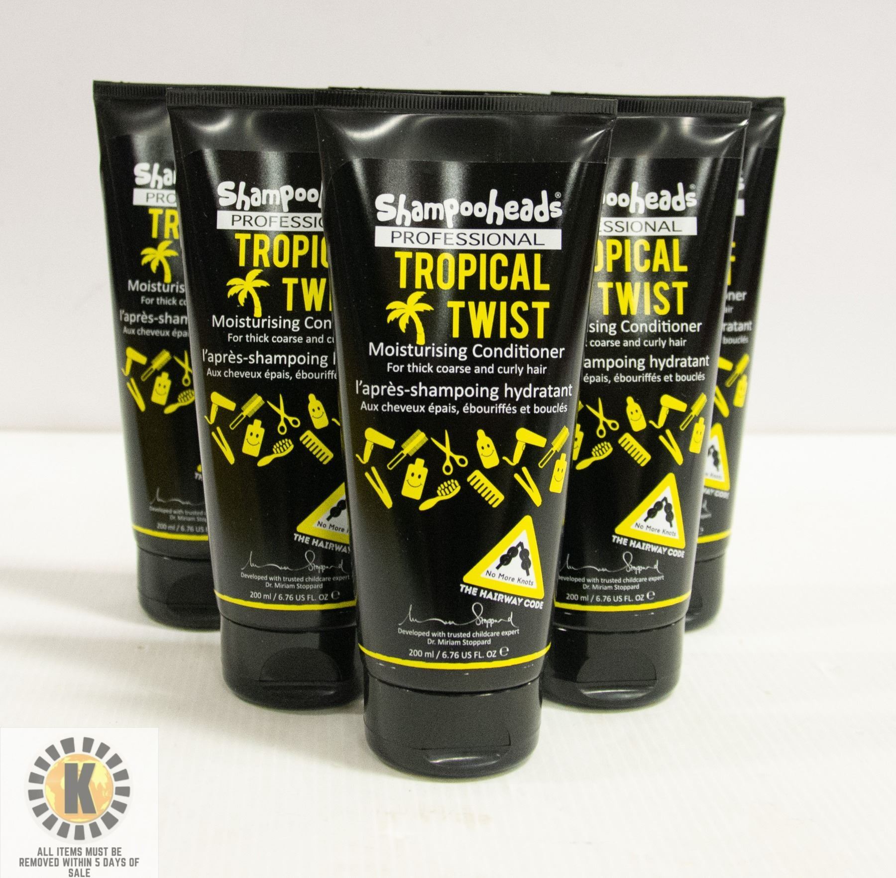 6 BOTTLES OF SHAMPOOHEADS PROFESSIONAL TROPICAL TWIST MOISTURIZING CONDITIONER FOR THICK OR CURLY HAIR 200mL PER BOTTLE. MUST BE REMOVED WITHIN 5 DAYS OF SALE.